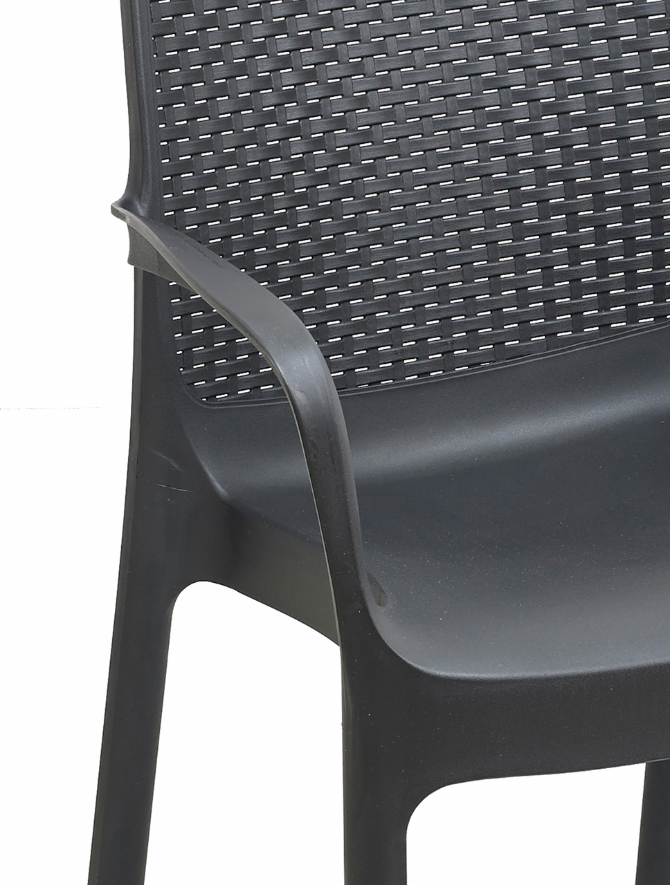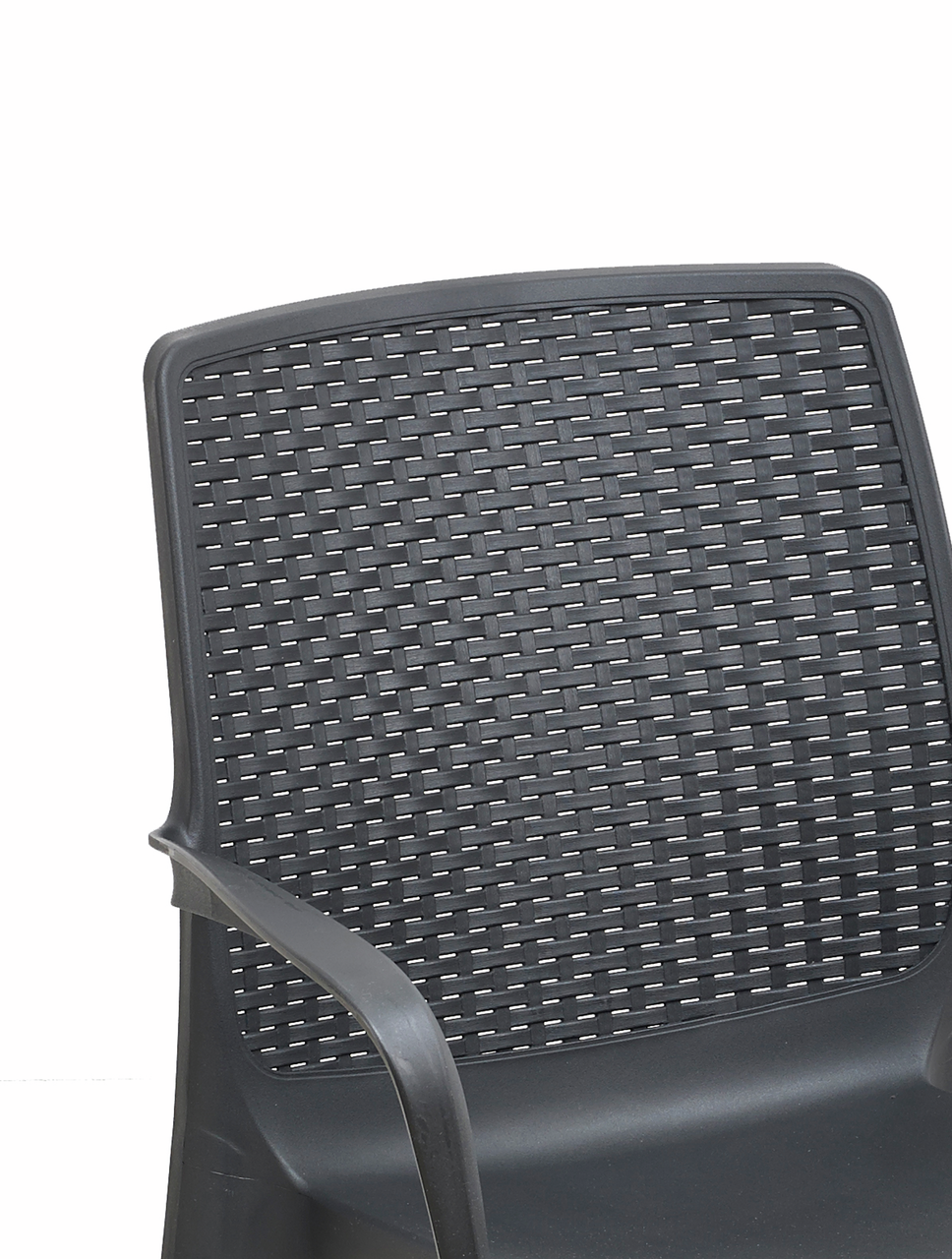 Размер кресла: 60,5x54x82см. Поверхность кресла выполнена в виде имитации искусственного ротанга. Кресло цвета антрацит изготовлено из ударопрочного полипропилена, стойкого к воздействию окружающей среды. Стул имеет квадратную спинку и подлокотники.