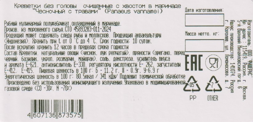 Креветки без головы очищенные чесночный маринад с травами охлажденные, 1кг