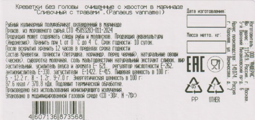 Креветки без головы очищенные сливочный маринад с травами охлажденные, 1кг