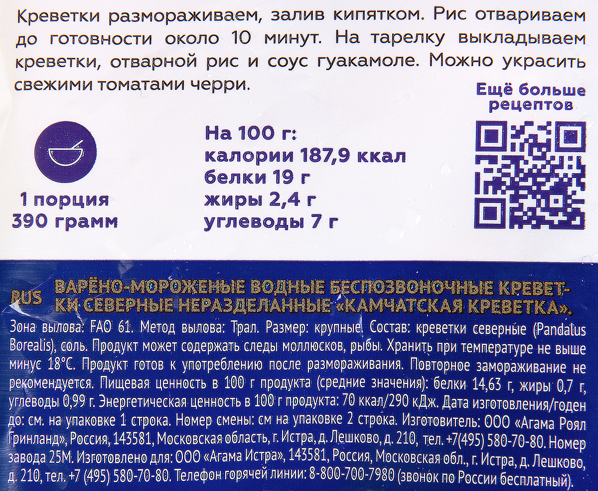 Креветки камчатские Agama 35/45 варено-мороженые, 800г