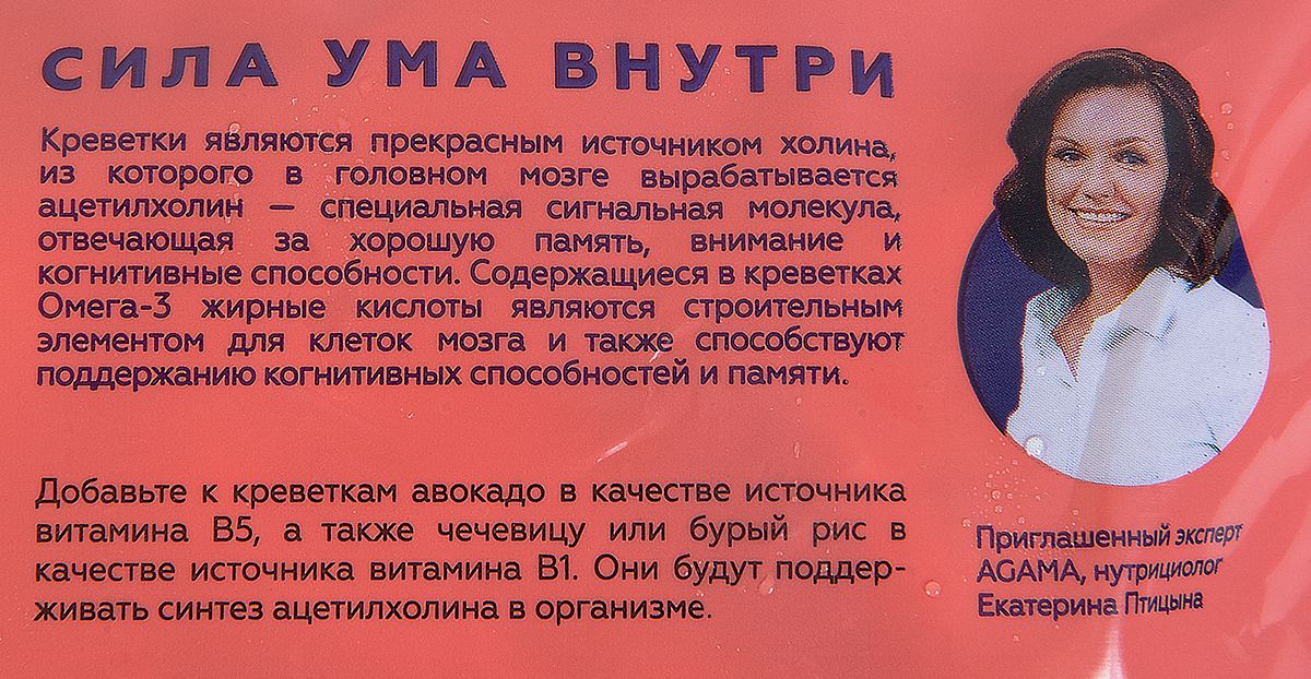 Креветки являются прекрасным источником холина, из которого в головном мозге вырабатывается ацетилхолин — специальная сигнальная молекула, отвечающая за хорошую память, внимание и когнитивные способности. Содержащиеся в креветках Омега-3 жирные кислоты являются строительным элементом для клеток мозга и также способствуют поддержанию когнитивных способностей и памяти.