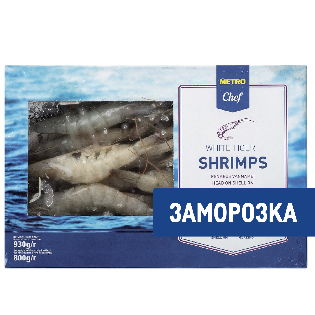 METRO Chef Креветки белоногие Penaeus vannamei 20/30 шт/упак в панцире с головой свежемороженые в упаковке 930г. Содержание глазури 14%.
