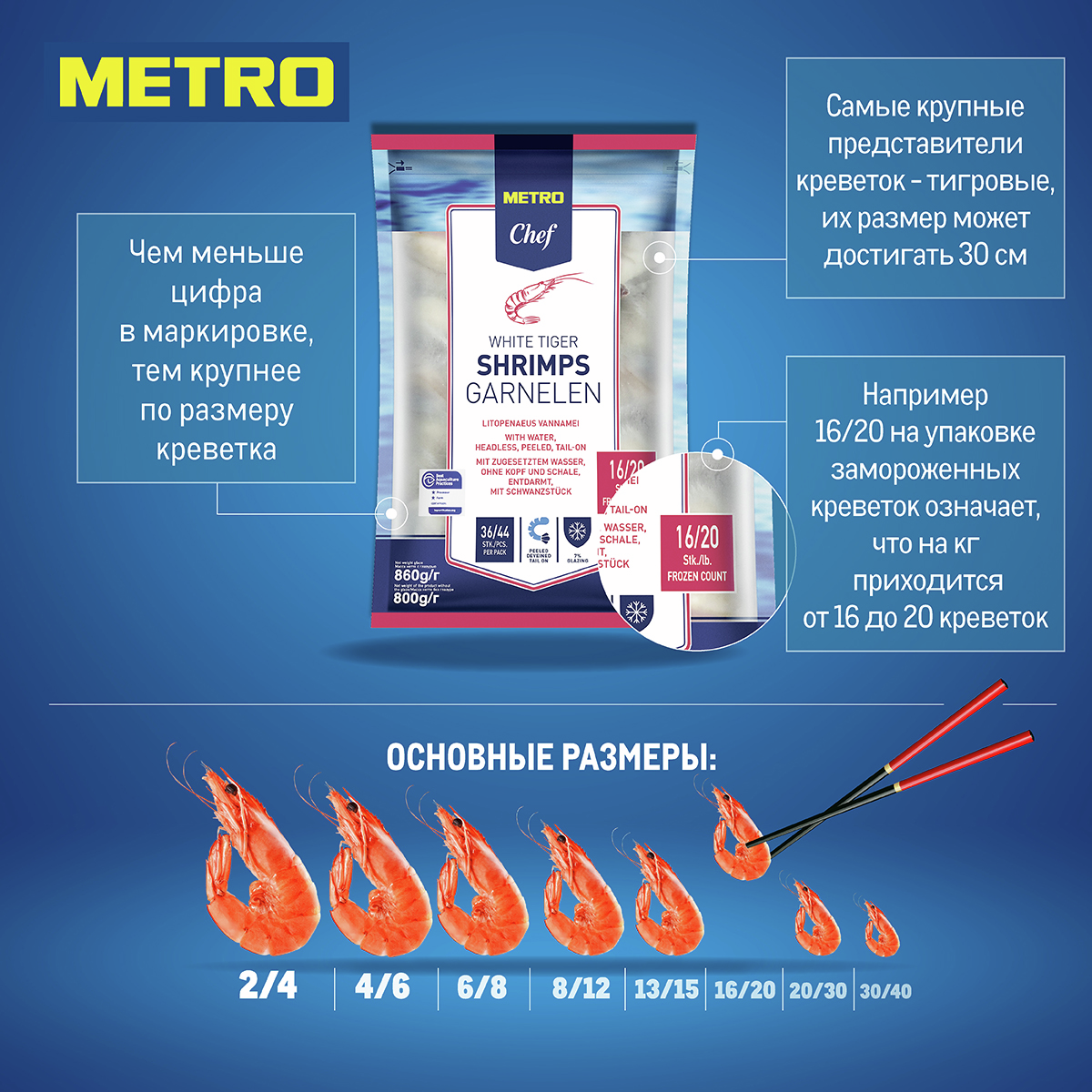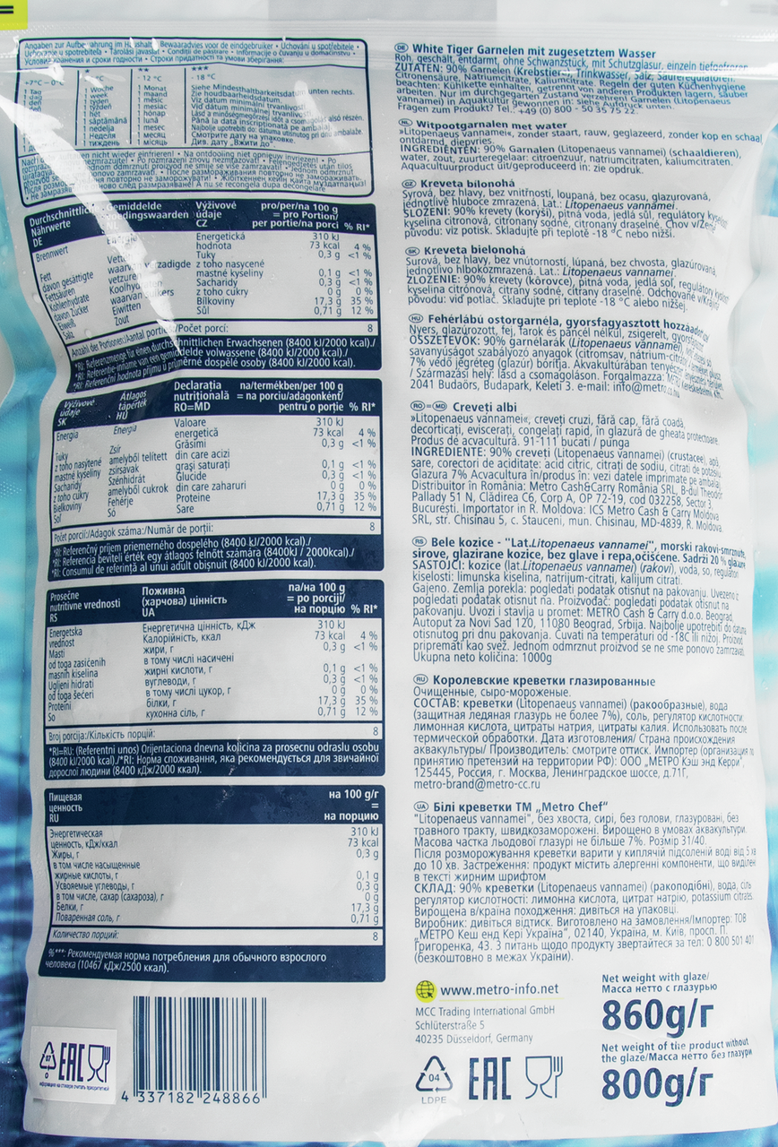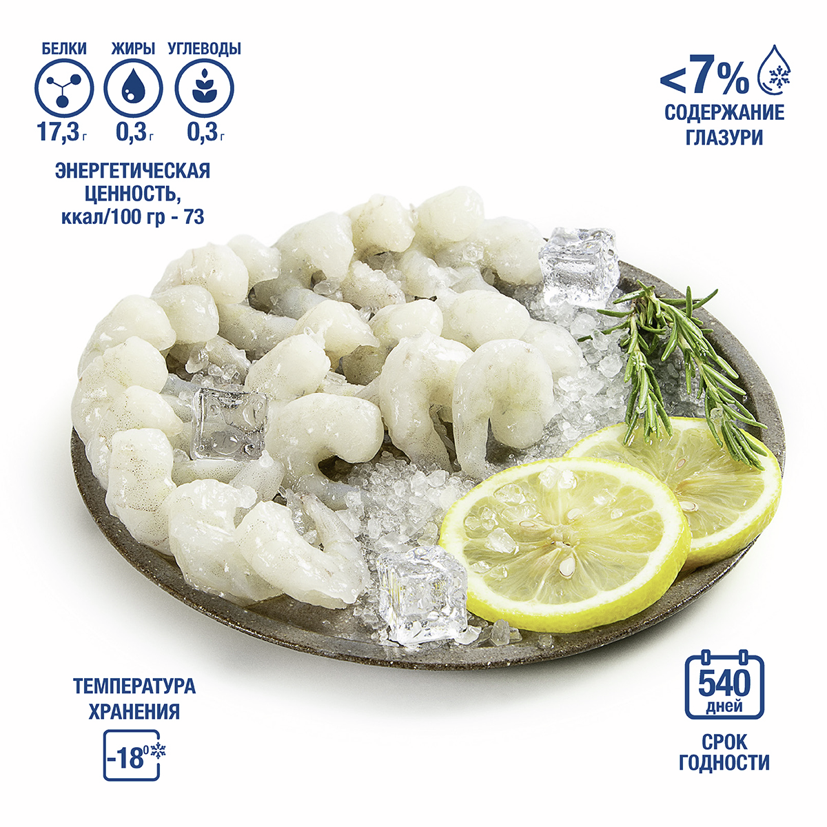 METRO Chef Креветки белоногие Litopenatus Vannamei 51/60 шт/фунт (113/132 шт/упак) очищенные свежемороженые в упаковке 860г. Содержание глазури 7%.