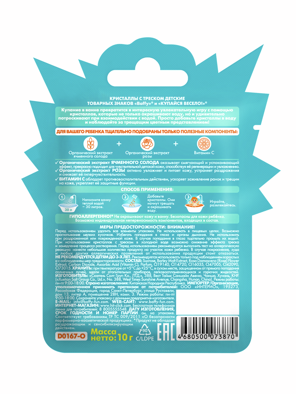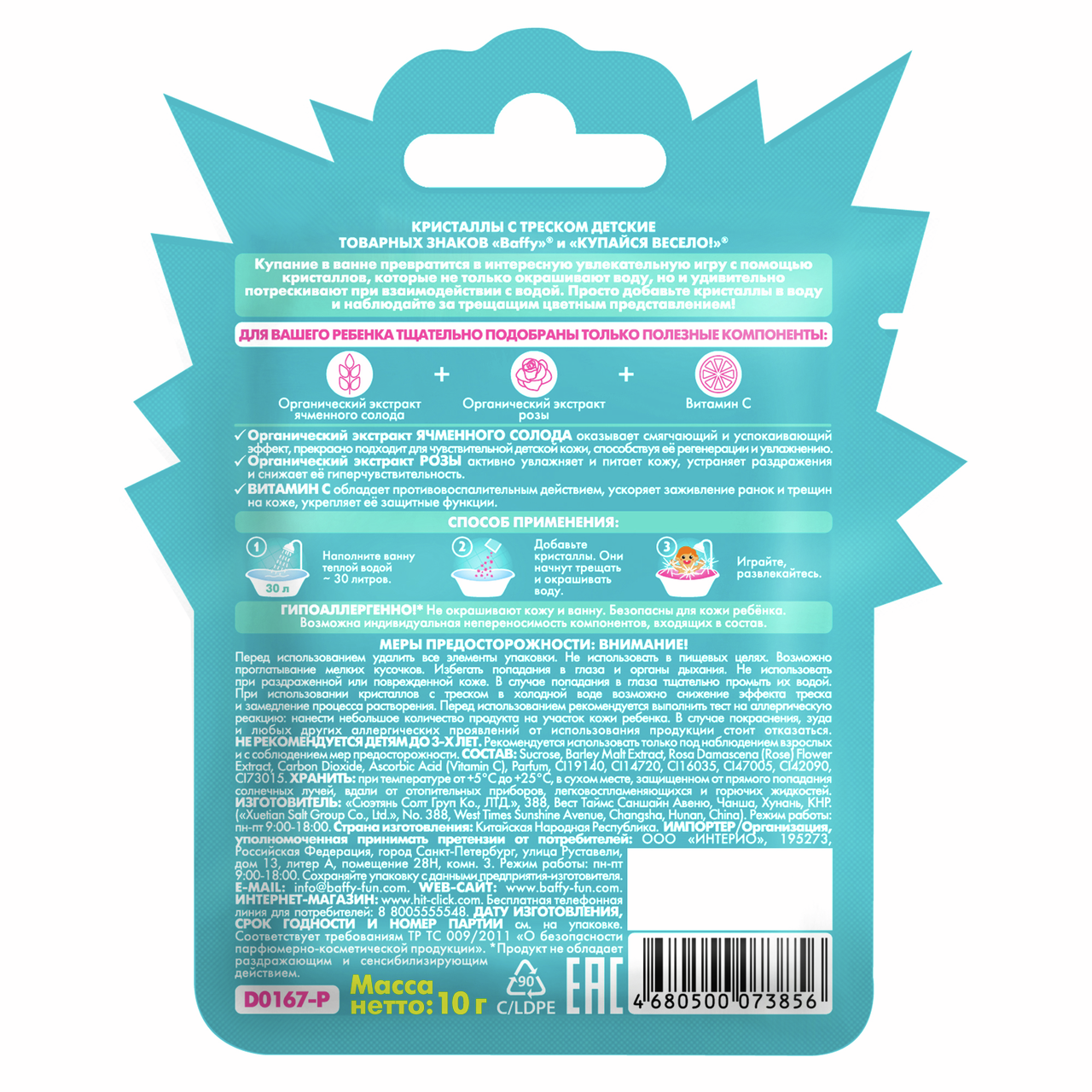 Кристаллы с треском Baffy, 10 г смогут за считаные секунды организовать веселое приключение во время водных процедур. При контакте с водой они моментально взрываются яркими красками. Характерное потрескивание сопровождает весь процесс. Ребенок будет с интересом и удовольствием наблюдать за тем, как обычное купание превращается в веселую игру с необычными световыми эффектами! Кристаллы находятся в небольшом дойпаке. Содержимое можно сразу высыпать в ванну или добавлять постепенно, небольшими порциями. Такой аксессуар поможет привить ребенку гигиенические навыки в игровой форме. Если существует риск, что малыш испугается, до начала процедур лучше продемонстрировать ему действие кристаллов в небольшом количестве воды.