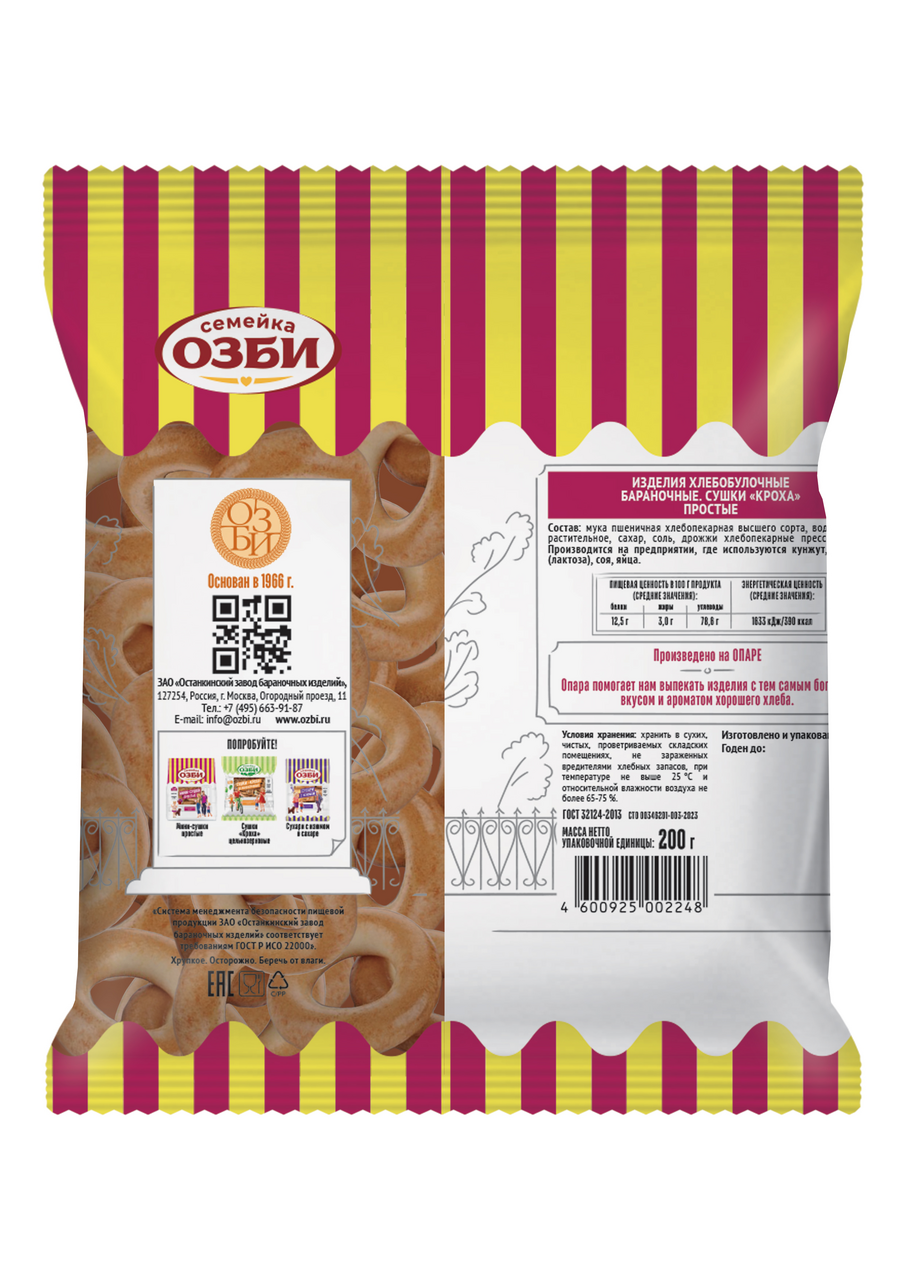 Простые сушки небольшого размера — румяные, хрустящие, с тонким ароматом! Попробуйте с чаем или возьмите с собой, чтобы похрустеть в перерыве или на перемене. Останкинский завод бараночных изделий — единственный в России завод, который специализируется исключительно на производстве сушек и баранок. Сушки Семейка Озби готовятся классическим способом с использованием опары. Натуральный состав позволяет рекомендовать сушки как перекус даже тем, кто выбирает здоровое питание!