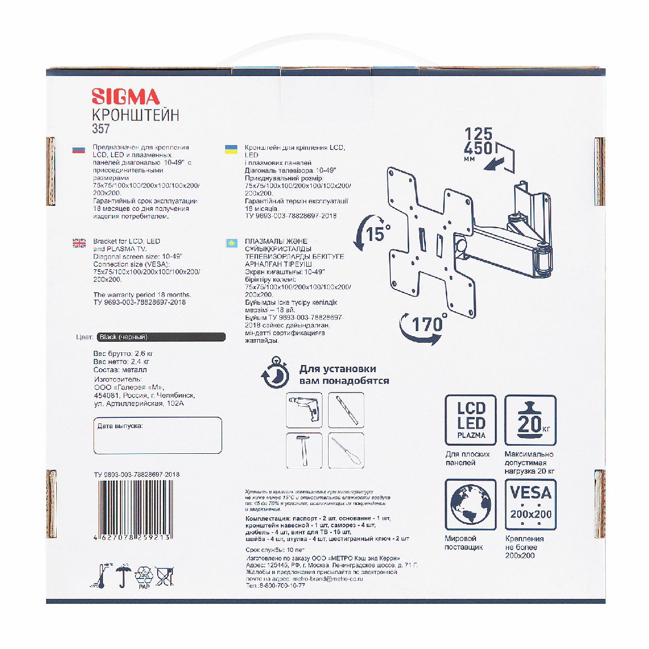 Кронштейн 357 SIGMA — уникальная находка для создания современного интерьера. Такое изделие позволяет прикрепить оборудование на стене, экономя пространство в помещении, и воплощать необычные дизайнерские решения. Оптимальное расстояние между стеной и техникой, а также особый угол наклона обеспечивает максимально комфортное пользование прибором. Вы можете не переживать за сохранность оборудования — кронштейн 357 SIGMA служит для наиболее надежного крепления и не теряет своей функциональности долгие годы. Изделие выполнено из высококачественного и прочного материала, отличающегося устойчивостью к износу, деформациям и коррозии. Преимущество данной модели — простота конструкции, с монтажом которой справится любой человек, не владеющий профессиональными навыками. В комплекте представлены все необходимые детали, а подробная инструкция пошагово описывает весь процесс установки.