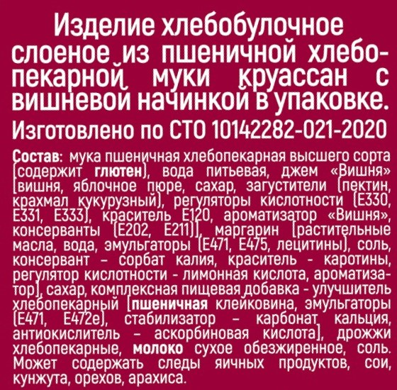 Мука пшеничная хлебопекарная высшего сорта содержит глютен, вода питьевая, джем Вишня вишня, яблочное пюре, сахар, загустители пектин, крахмал кукурузный, регуляторы кислотности Е330, Е331, Е333, краситель Е120, ароматизатор Вишня, консерванты Е202, Е211, маргарин растительные масла, вода, эмульгаторы Е471, Е475, лецитины, соль, консервант – сорбат калия, краситель - каротины, регулятор кислотности - лимонная кислота, ароматизатор, сахар, комплексная пищевая добавка - улучшитель хлебопекарный пшеничная клейковина, эмульгаторы Е471, Е472е, стабилизатор – карбонат кальция, антиокислитель – аскорбиновая кислота, дрожжи хлебопекарные, молоко сухое обезжиренное, соль.
