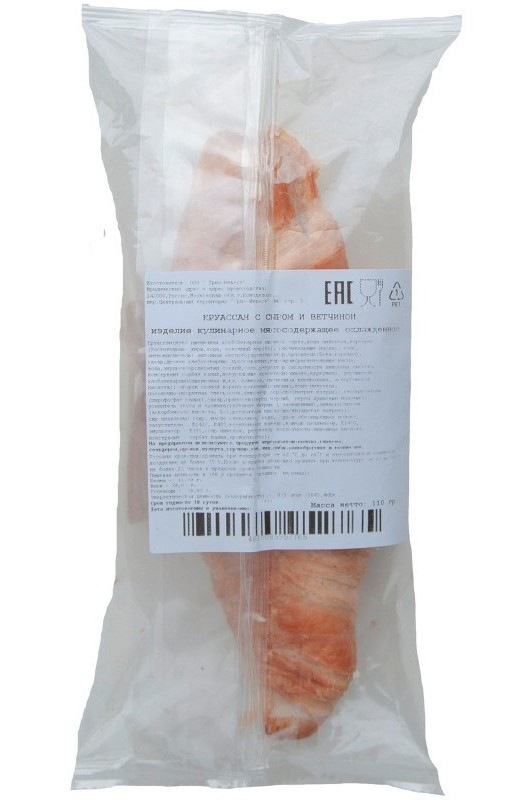 Круассан (мука пшеничная хлебопекарная высшего сорта, вода питьевая, маргарин (Растительные жиры, вода, молочный жир (8%), растительные масла), соль, антиокислитель: лимонная кислота; ароматизатор, краситель: бета-каротин), сахар, дрожжи хлебопекарные прессованные, маргарин (растительные масла, вода, эмульгатор: лецитин соевый, соль, регулятор кислотности лимонная кислота, консервант сорбат калия, натуральные красители: аннато, куркумин), улучшитель хлебопекарный (пшеничная мука, глюкоза, пшеничная клейковина, аскорбиновая кислота); окорок свиной варено-копченый (свинина, вода питьевая, посолочно-нитритная смесь (соль, фиксатор окраски (нитрит натрия)), стабилизаторы (пирофосфат калия), сахар, пряности (перец черный, перец душистый молотые), усилитель вкуса и аромата (глутамат натрия 1-замещенный), антиокислитель (аскорбиновая кислота, L-), регуляторы кислотности (ацетат натрия)); сыр плавленый (сыр, масло сливочное, вода, сухое обезжиренное молоко, загустители – Е1422, Е407, ксантановая камедь, камедь целлюлозы, Е1450, эмульгатор – Е331, соль пищевая, регулятор кислотности – лимонная кислота, консервант – сорбат калия, ароматизатор).