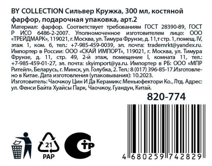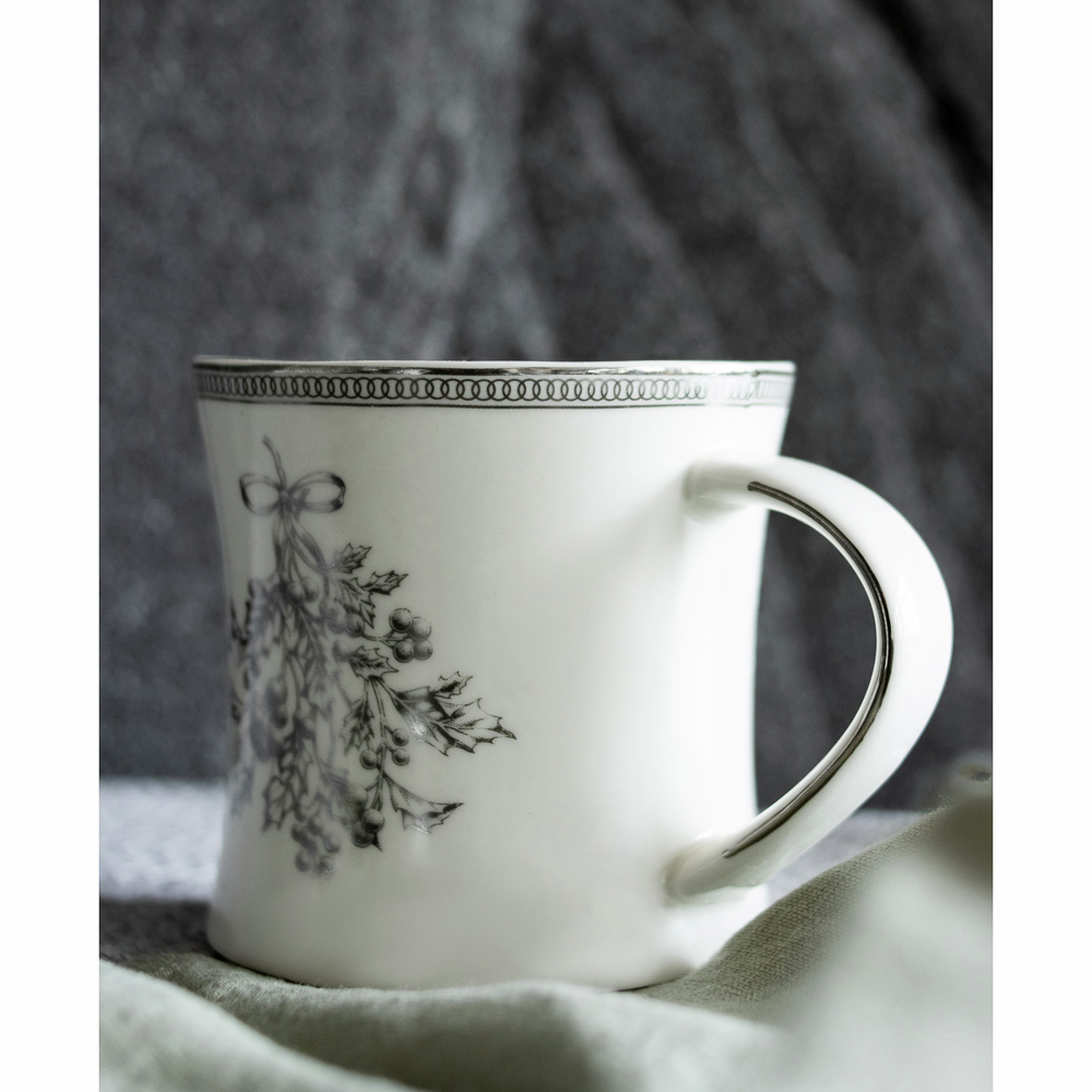 Кружка By Collection Сильвер дизайн 2, 300 мл выполнена из высококачественного костяного фарфора повышенной прочности, имеет оригинальный изящный дизайн и впишется в любой стиль оформления стола. Кружка устойчивая, имеет оптимальный объем для любых напитков: чая, кофе, какао. Изделия можно использовать в посудомоечной машине, а также очищать ручным способом с помощью влажной губки, моющего средства и проточной воды. Кружка может стать приятным подарком по любому поводу.