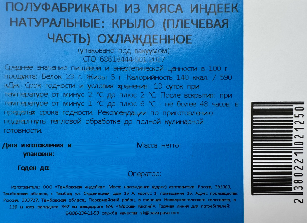 Крыло индейки Пава Пава плечевая часть охлажденное, ~2кг