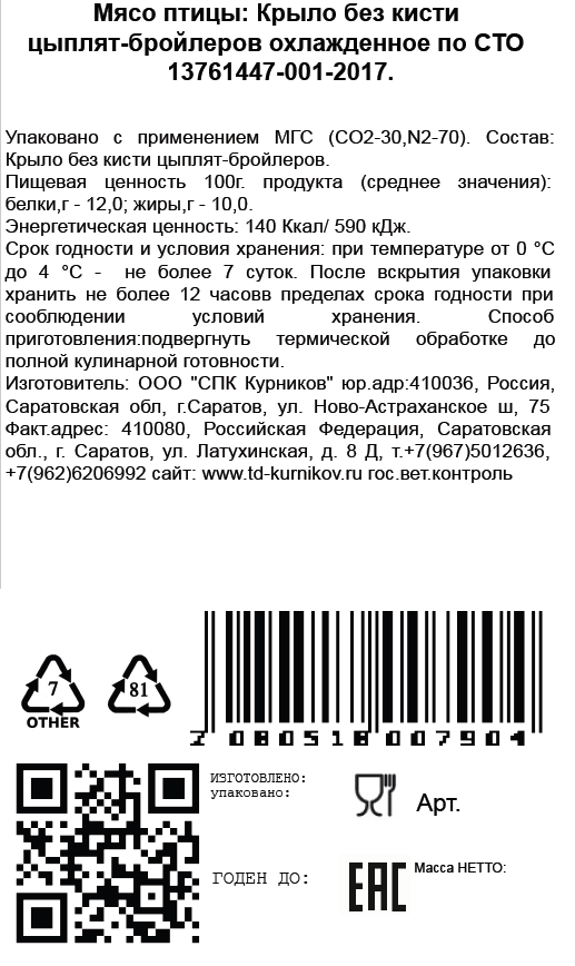Линейка продуктов Отборное представляет собой высококачественные, безопасные продукты куриной разделки, изготовленные из лучшего сырья, под контролем нашей лаборатории. Продукция предназначена для питания, на основании требований национальных стандартов и требований законодательства РФ. В процессах производства полностью исключено применение каких-либо пищевых добавок, в частности регуляторов кислотности, усилителей вкуса и консервантов. Для сохранности продукта предусмотрена упаковка с применением модифицированной газовой среды, которая замедляет процессы порчи, не влияя на потребительские свойства мяса птицы. Крыло цыпленка-бройлера состоит из кисти, локтевой и плечевой части. При желании их можно отделить друг от друга по хрящам или готовить продукт целиком. Содержащееся в куриных крыльях мясо отличается сочностью, поскольку располагается вплотную к кости. Приготовленные на гриле крылышки - одна из любимых закусок с аппетитной хрустящей корочкой. Если замариновать их с медом, соевым соусом и чесноком, то к блюду даже не потребуется соус.