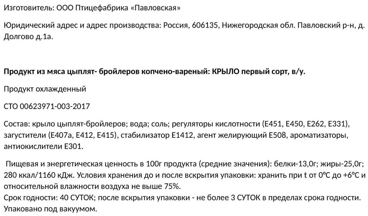 Крыло цыпленка-бройлера Павловская курочка копчено-вареное, ~500г
