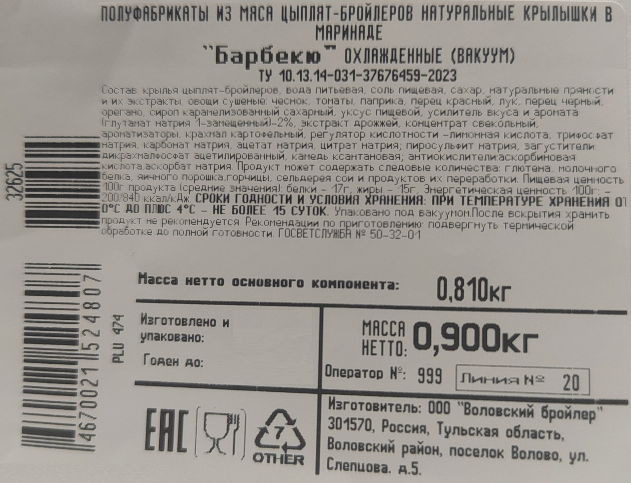 Крылья цыплят-бройлеров, вода питьевая, соль пищевая, сахар, натуральные пряности и их экстракты, овощи сушёные: чеснок, томаты, паприка, перец красный, лук, перец чёрный, орегано, сироп карамелизованный сахарный, уксус пищевой, усилитель вкуса и аромата глутамат натрия 1-замещенный, экстракт дрожжей, концентрат свекольный, ароматизаторы, крахмал картофельный, регулятор кислотности - лимонная кислота, трифосфат натрия, карбонат натрия, ацетат натрия, цитрат натрия; пиросульфит натрия, загустители: дикрахмалфосфат ацетилированный, камедь ксантановая; антиокислители: аскорбиновая кислота, аскорбат натрия.