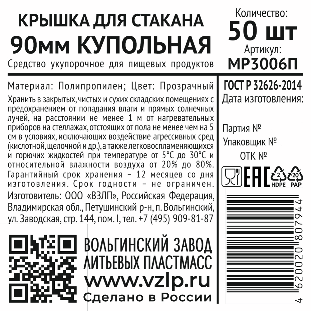 Крышка для стакана одноразовая Vzlp купольная пластиковая прозрачная 9см, 50шт