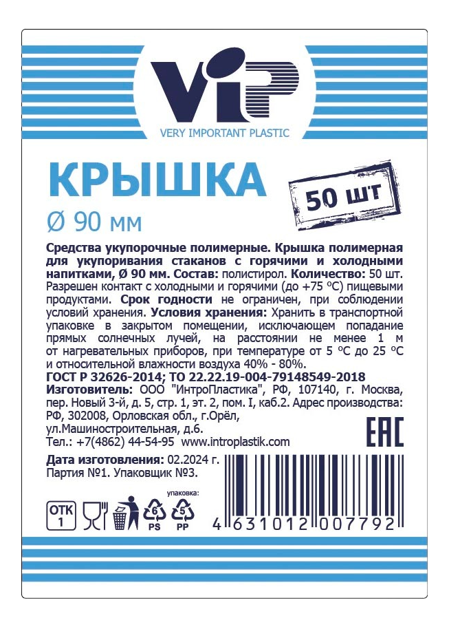Крышка подходит к одноразовыми стаканами: Арт 242698;242710;242699;373745;242699; 272714. Крышка для стаканов Vip 90мм x 50шт - средства укупорочные полимерные. Крышка полимерные для укупоривания стаканов с горячими и холодными напитками. Изготовлена таким образом, что плотно прилегает к горлышку стакана. В ней расположены питьевое отверстие и встроенный клапан для его закрывания.
