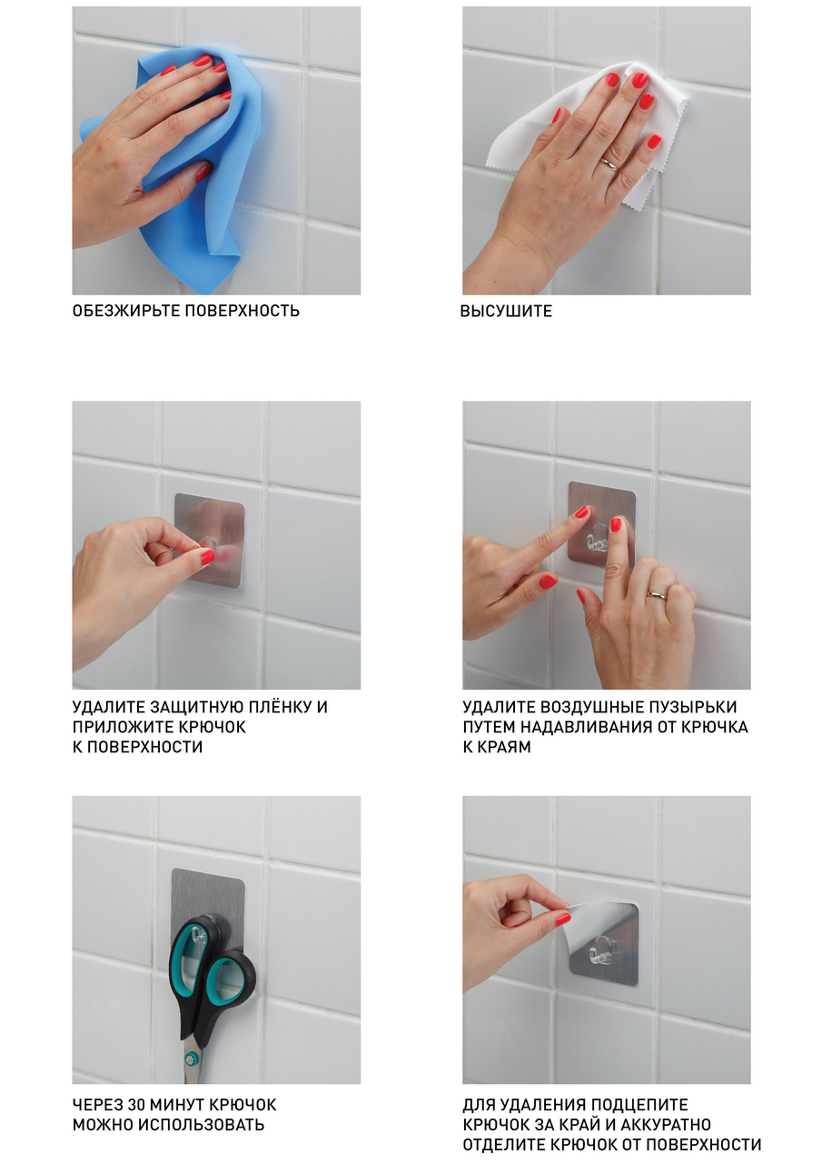 Набор настенных многоразовых крючков "Сила" изготовлен из высококачественного ПВХ на силиконовом основании. Крючки прекрасно подойдут для вашей ванной комнаты или кухни и не займут много места. Они не оставляют следов и не портят поверхность. Силиконовое крепление лучше всего работает на чистой гладкой поверхности. При загрязнении рабочей поверхности крючка промойте ее под теплой водой и дождитесь полного высыхания до использования. Не резать, не сгибать, не скручивать силиконовую подложку. Не использовать нагрузки более 1,5 кг.