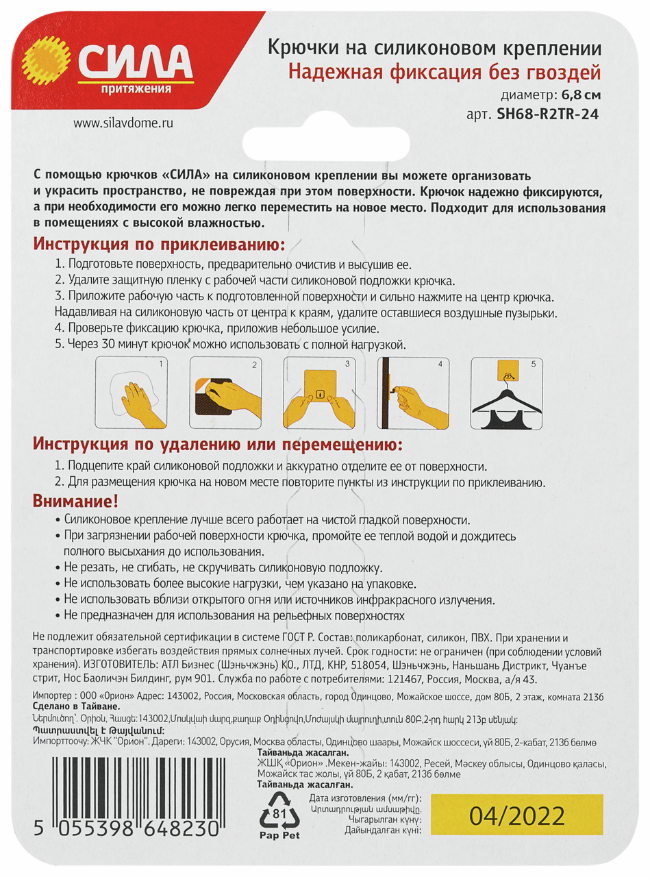 Набор настенных многоразовых крючков "Сила" изготовлен из высококачественного ПВХ на силиконовом основании. Крючки прекрасно подойдут для вашей ванной комнаты или кухни и не займут много места. Они не оставляют следов и не портят поверхность. Силиконовое крепление лучше всего работает на чистой гладкой поверхности. При загрязнении рабочей поверхности крючка промойте ее под теплой водой и дождитесь полного высыхания до использования. Не резать, не сгибать, не скручивать силиконовую подложку. Не использовать нагрузки более 1,5 кг.