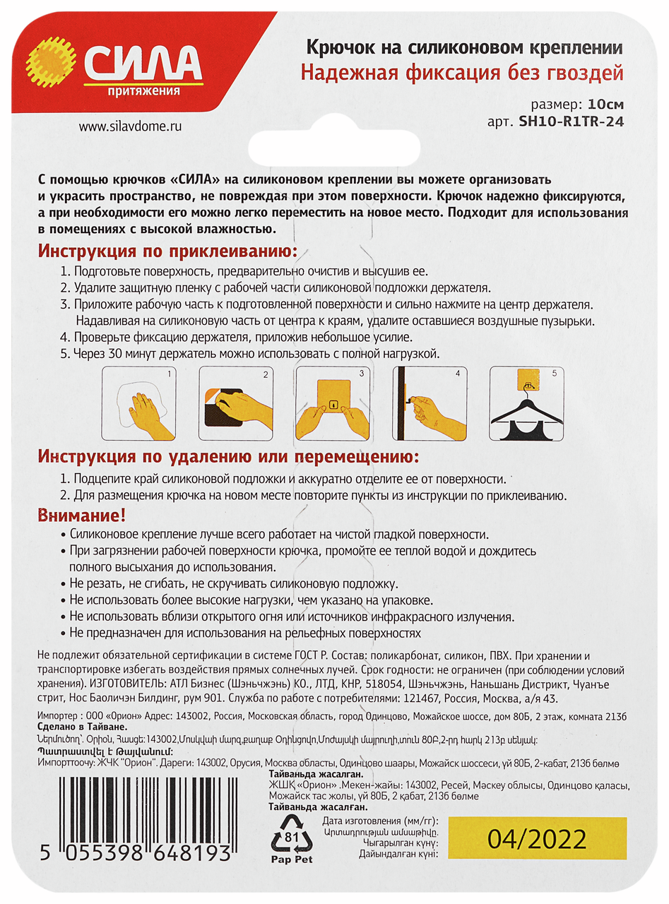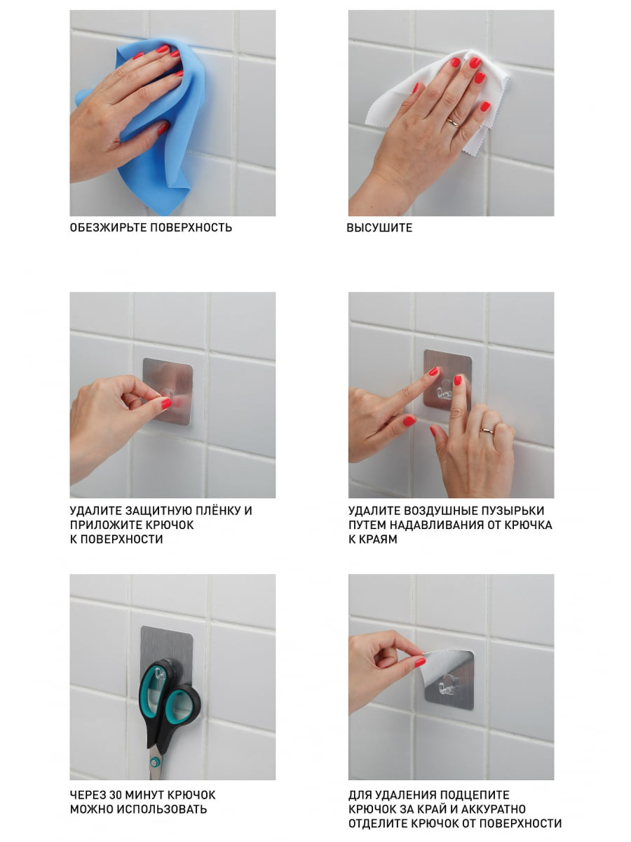 Набор настенных многоразовых крючков "Сила" изготовлен из высококачественного ПВХ на силиконовом основании. Крючки прекрасно подойдут для вашей ванной комнаты или кухни и не займут много места. Они не оставляют следов и не портят поверхность. Силиконовое крепление лучше всего работает на чистой гладкой поверхности. При загрязнении рабочей поверхности крючка промойте ее под теплой водой и дождите��ь полного высыхания до использования. Не резать, не сгибать, не скручивать силиконовую подложку. Не использовать нагрузки более 2,5 кг.
