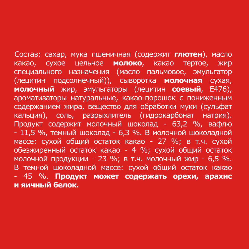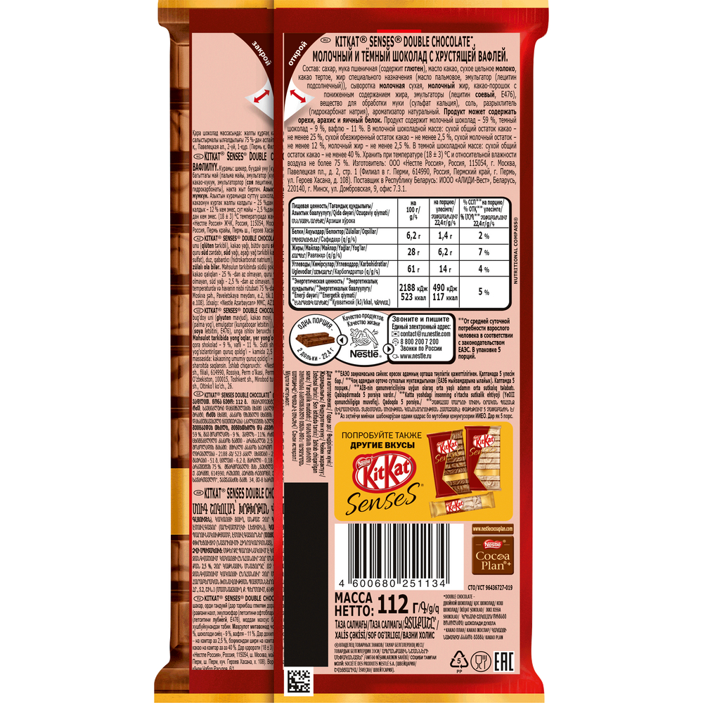 КITKAT SENSES DOUBLE CHOCOLATE Молочный и темный шоколад с хрустящей вафлей 112 г. KitKat - это оригинальное сочетание молочного шоколада и хрустящей вафли. Шоколадный батончик KitKat DUO - отличный вариант для любого перерыва. KitKat - популярный бренд и один из лидеров на российском рынке батончиков. Есть перерыв, есть KitKat! Без искуственных красителей, ароматизаторов и консервантов.Вы можете купить КITKAT SENSES DOUBLE CHOCOLATE Молочный и темный шоколад с хрустящей вафлей 112 г в торговом центре METRO.Тип: кондитерские изделия.Состав: Сахар, мука пшеничная (содержит глютен), масло какао, сухое цельное молоко, какао тертое, жир специального назначения (масло пальмовое, эмульгатор (лецитин подсолнечный)), сыворотка молочная сухая, молочный жир, какао-порошок с пониженным содержанием жира, эмульгаторы (лецитин соевый, Е476), ароматизаторы натуральные, вещество для обработки муки (сульфат кальция), соль, разрыхлитель (гидрокарбонат натрия). Продукт содержит молочный шоколад - 59,9 %, вафлю - 11,5 %, темный шоколад - 9,6 %. В молочной шоколадной массе: сухой общий остаток какао - 27 %; в т.ч. сухой обезжиренный остаток какао - 4 %; сухой общий остаток молочной продукции - 23 %; в т.ч. молочный жир - 6,5 %. В темной шоколадной массе: сухой общий остаток какао - 45 %.Продукт может содержать орехи, арахис и яичный белок.Бренд: KitKat.Название производителя: ООО Нестле Россия.Вес нетто: 0.112 кг.Тип упаковки: обёртка.БЖУ: 5.9/28/61.Энергентическая ценность: 523ккал/2186кДж.Условия хранения: от 15 C до 21 C.Срок годности: 270 дней.
