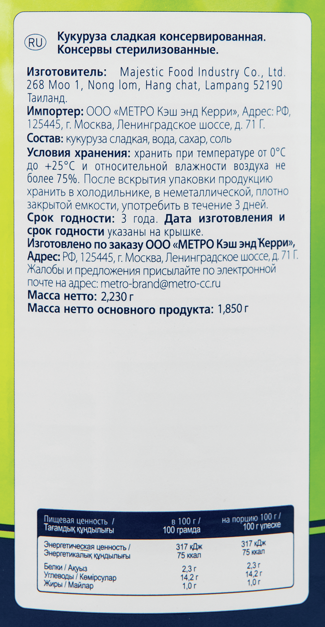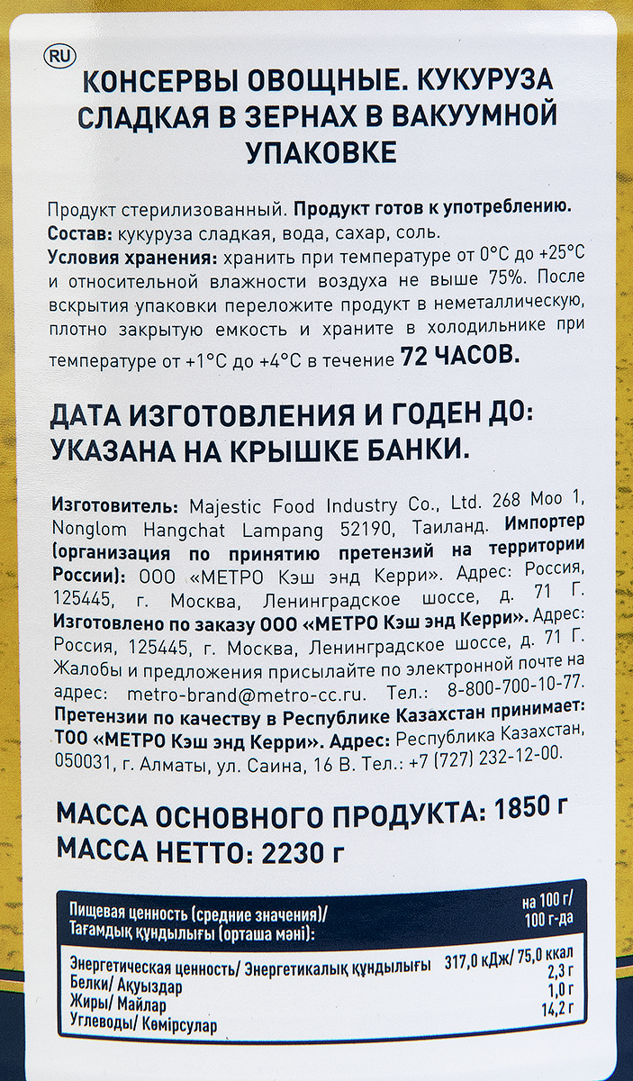 Кукуруза сладкая Metro Chef, 2230 г – полностью готовый к употреблению продукт. Спелые ярко-желтые сочные зерна обладают насыщенным и приятным вкусом. Кукурузу можно подать и в качестве оригинального гарнира. Сладкий продукт хорошо утоляет голод, восстанавливает силы и отлично усваивается. За счет богатого содержания клетчатки она положительно влияет на пищеварение, стимулируя работу органов желудочно-кишечного тракта. Употребление кукурузы активизирует метаболизм, улучшает сердечную и мозговую деятельность, способствует избавлению от токсинов, укрепляет сосуды, положительно сказывается на состоянии кожи, волос и ногтей. Консервированный продукт помещен в герметичную жестяную банку.