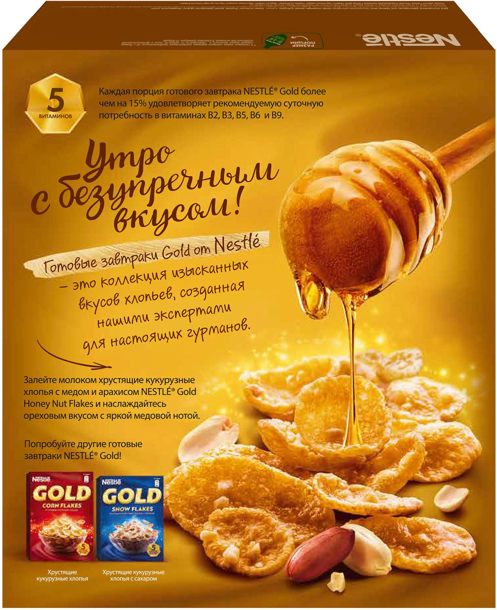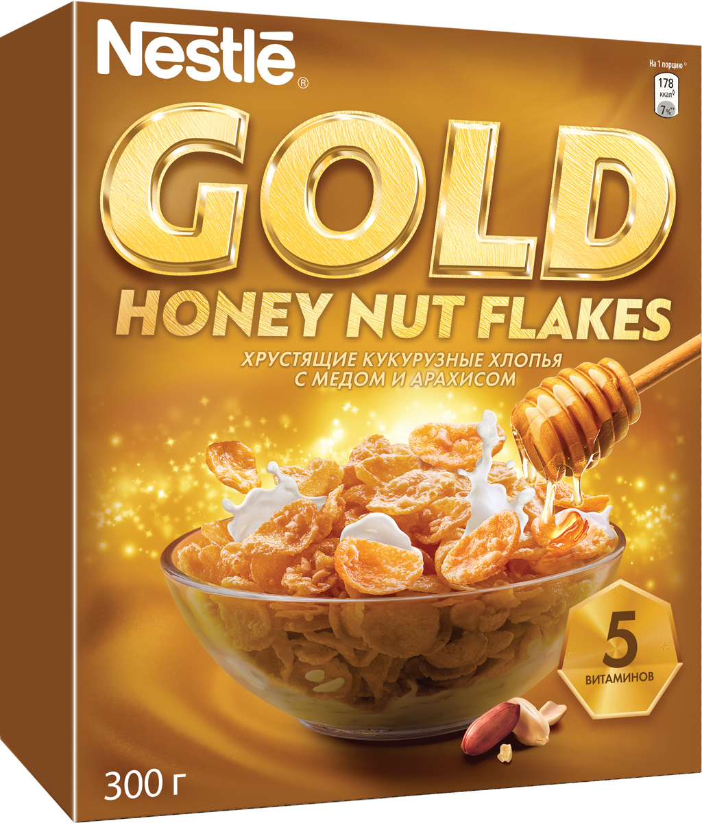Готовый завтрак Nestle Gold Honey Nut Flakes (Нестле Голд Хани Нат Флейкс) - это отличный завтрак для всей семьи! Это хрустящие кукурузные хлопья с медом и арахисом, дополнительно обогащенные комплексом витаминов. Вы любите начинать утро с полезного, качественного и вкусного завтрака? Вы привыкли выбирать для себя только самое лучшее? Тогда кукурузные хлопья с медом и арахисом Gold Honey Nut Flakes - для вас!