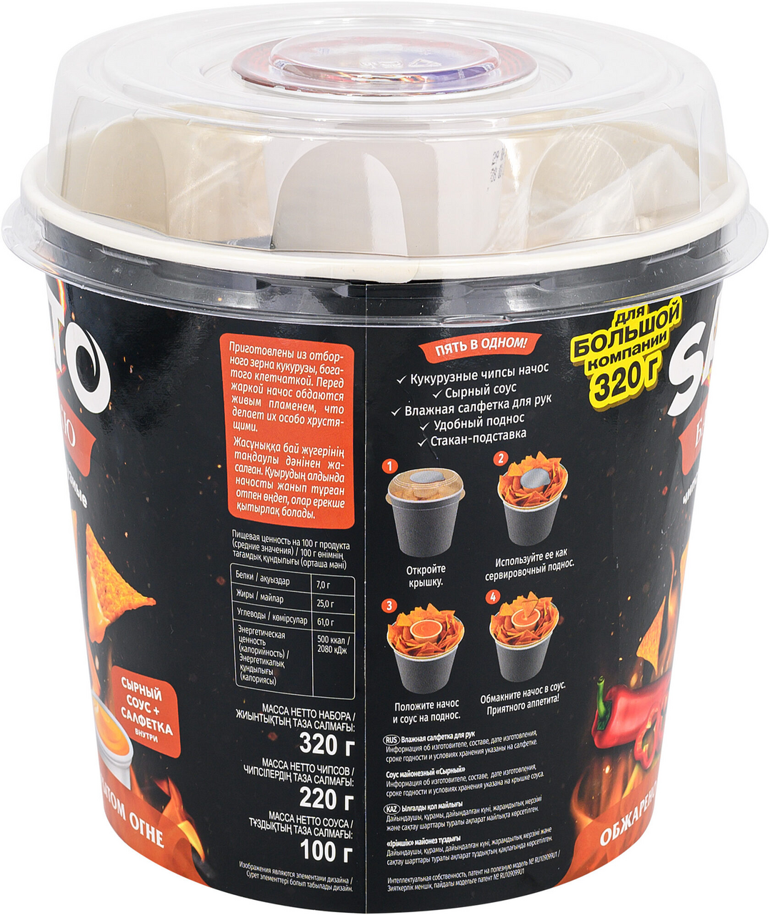 Чипсы кукурузные Salto с соусом барбекю отлично подойдут в качестве закуски во время праздника или на природе. Устойчивая жесткая банка вмещает в себя ломтики поджаренной тортильи классической для начос треугольной формы. В меру соленые чипсы изготовлены из кукурузной муки высшего сорта и обладают более нежным вкусом по сравнению с картофельными. В набор входит баночка с соусом барбекю, созданным по рецептам южноамериканской кухни с использованием жгучего перца, паприки и чеснока. Упаковка закрывается многоразовой крышкой, что удобно во время прогулки. В комплекте также предусмотрена влажная салфетка для рук.