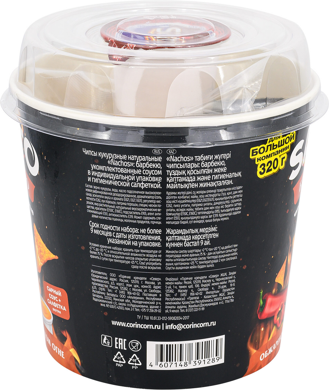 Зерно кукурузы, вода, масло подсолнечное высокоолеиновое рафинированное дезодорированное, ароматизатор соль, сахар, усилители вкуса и аромата Е621, Е627, Е631, регулятор кислотности Е262, лук порошок, паприка порошок, специи, чеснок порошок, жир растительный, натуральные вкусоароматические вещества, красители Е150С, Е160С, подсластитель Е955, агент антислеживающий Е551, антиокислитель Е319.