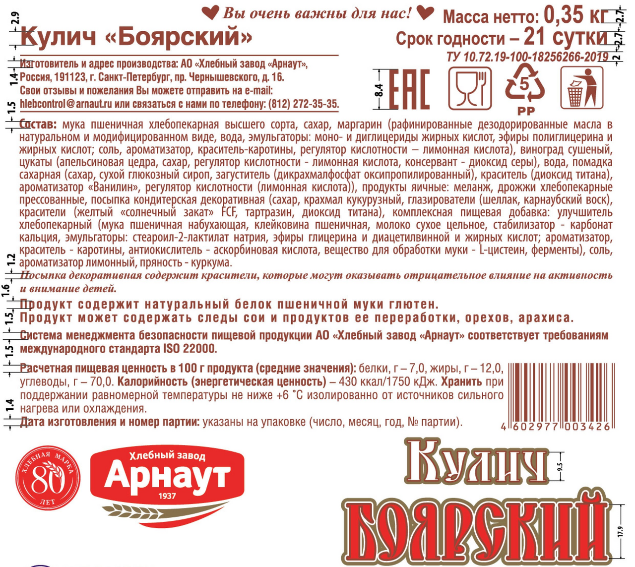 Мука пшеничная хлебопекарная высшего сорта, сахар, маргарин (рафинированные дезодорированные масла в натуральном и модифицированном виде, вода, эмульгаторы: моно- и диглицериды жирных кислот, эфиры полиглицерина и жирных кислот; соль, ароматизатор, краситель-каротины, регулятор кислотности - лимонная кислота), виноград сушеный, цукаты (апельсиновая цедра, сахар, регулятор кислотности - лимонная кислота, консервант - диоксид серы), вода, помадка сахарная (сахар, сухой глюкозный сироп, загуститель (дикрахмалфосфат оксипропилированный), краситель (диоксид титана), ароматизатор Ванилин, регулятор кислотности (лимонная кислота)), продукты яичные: меланж, дрожжи хлебопекарные прессованные, посыпка кондитерская декоративная (сахар, крахмал кукурузный, глазирователи (шеллак, карнаубский воск) красители (желтый солнечный закат FCF, тартразин, диоксид титана), комплексная пищевая добавка: улучшитель хлебопекарный (мука пшеничная набухающая, клейковина пшеничная, молоко сухое цельное, стабилизатор - карбонат кальция, эмульгаторы: стеароил-2-лактилат натрия, эфиры глицерина и диацетилвинной и жирных кислот; ароматизатор, краситель - каротины, антиокислитель - аскорбиновая кислота, вещество для обработки муки - L-цистеин, ферменты), соль, ароматизатор лимонный, пряность – куркума, ароматизатор пищевой лимонный.