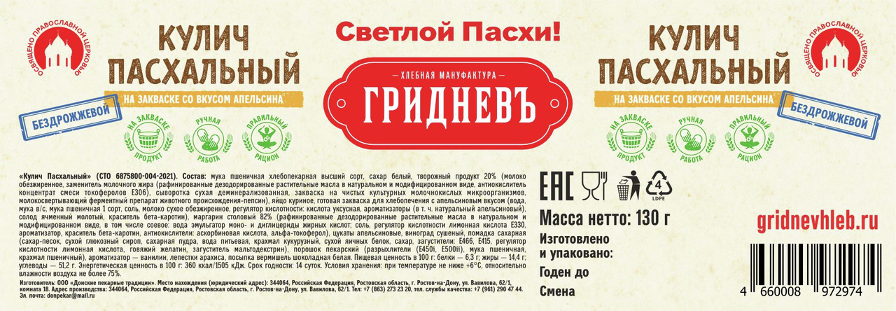 Кулич Гридневъ Пасхальный на закваске со вкусом апельсина, 130г