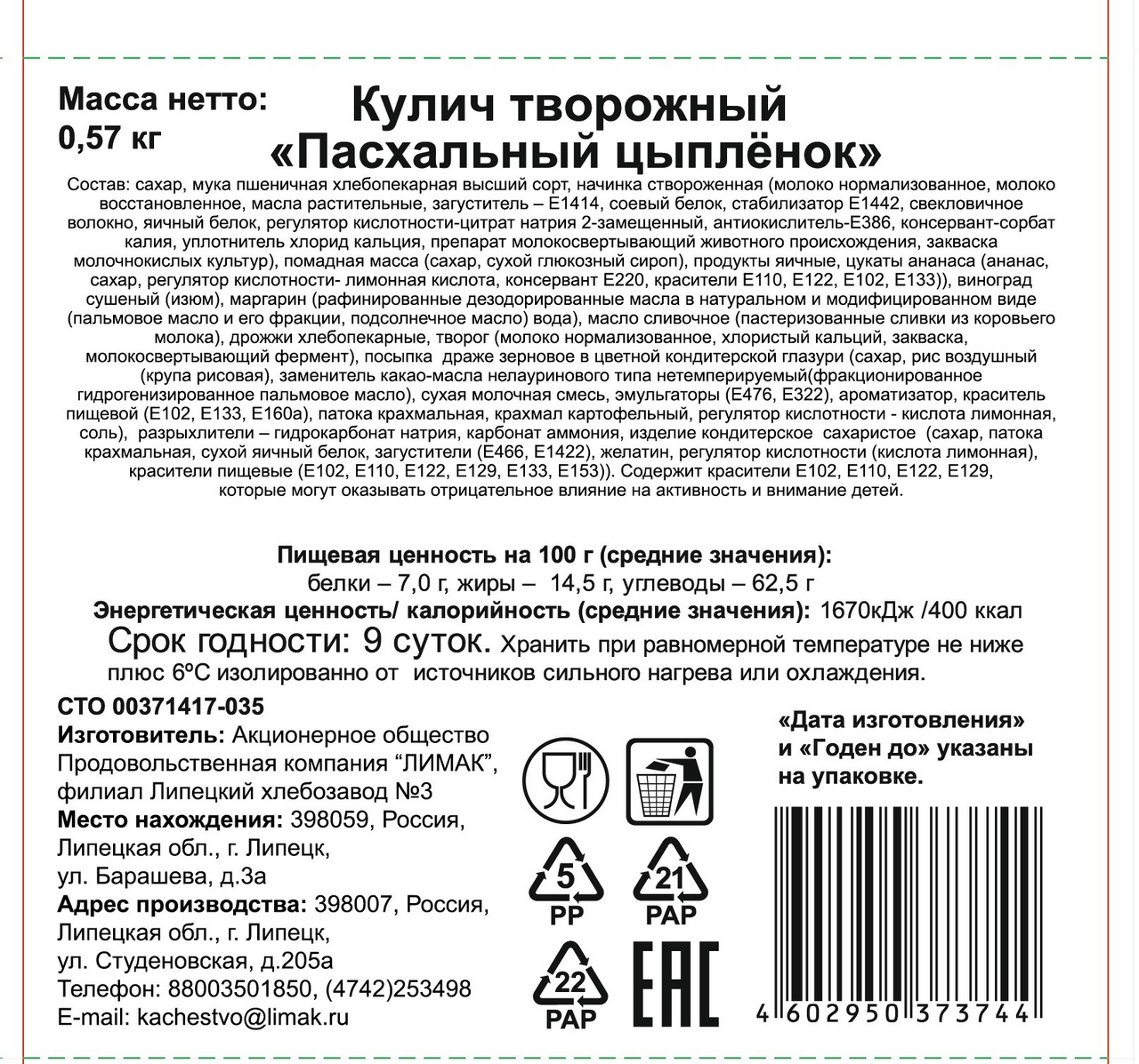 Сахар, мука пшеничная хлебопекарная в/с, творог (молоко цельное, молоко обезжиренное, молокосвертывающий ферментный препарат, уплотнитель - хлористый кальций, с использованием закваски молочнокислых микроорганизмов), помадка белая (сахар, патока), продукты яичные, цукаты, виноград сушеный, маргарин (рафинированные дезодорированные растительные масла в натуральном виде (в т.ч. соевое), вода, эмульгатор: Е471, Е475, соль, сахар, консервант Е202, регулятор кислотности лимонная кислота, ароматизатор, краситель бета-каротин, антиокислитель: Е300, Е307), масло сливочное (пастеризованные сливки из коровьего молока), посыпка сахарная драже зерновое желтое и зеленое (сахар, жир растительный, экстракт яично-солодовый, молоко сухое обезжиренное, ароматизатор, эмульгатор: лецитин соевый, регулятор кислотности - лимонная кислота, патока, красители пищевые Е150а, Е110, Е141i, соль), разрыхлители - гидрокарбонат натрия, карбонат аммония, сахаристое кондитерское украшение (сахарная пудра, патока, студнеобразователь - желатин сухой, яичные продукты, регулятор кислотности - лимонная кислота, ароматизаторы, красители: Е102, Е110, Е122, Е124, Е133, Е155), вафельное декоративное кондитерское украшение (крахмал картофельный, молоко сухое обезжиренное, сахар, глюкозный сироп, загустители - гуммиарабик, пектин, эмульгатор - соевый лецитин, регулятор кислотности - лимонная кислота, красители: Е102, Е122, Е133, Е172).
