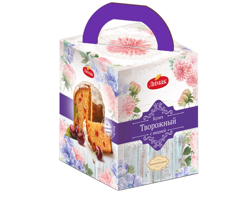 Кулич с добавлением нежного творога и вишни, упакован в нарядную коробку. Выпечен из бездрожжевого теста. Отлично подойдет для подарка на Светлый Праздник или к семейному празднику.