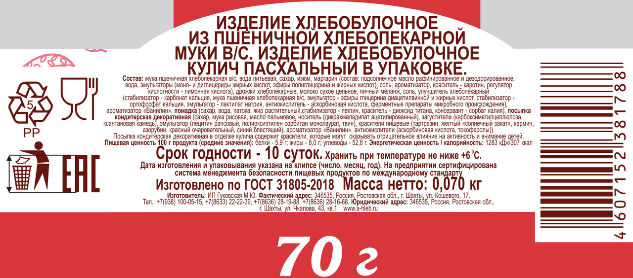 Мука пшеничная хлебопекарная высшего сорта, вода питьевая, сахар, изюм, маргарин (подсолнечное масло рафинированное и дезодорированное, вода, эмульгаторы (моно- и диглицериды жирных кислот, эфиры полиглицерина и жирных кислот), соль поваренная пищевая, ароматизатор, краситель - каротин, регулятор кислотности - лимонная кислота), дрожжи хлебопекарные прессованные, сухая молочная сыворотка, яичный меланж, соль поваренная пищевая, улучшитель хлебопекарный (стабилизатор - карбонат кальция, мука пшеничная хлебопекарная высшего сорта, эмульгатор - эфиры глицерина диацетилвинной и жирных кислот, стабилизатор - ортофосфат кальция, эмульгатор - лактилат натрия, антиокислитель - аскорбиновая кислота, ферментные препараты, микробного происхождения), ароматизатор Ванилин, помадка (сахар, вода, патока, жир растительный, стабилизатор-пектин, краситель - диоксид титана, консервант - сорбат калия), посыпка кондитерская декоративная (сахар, мука рисовая, масло пальмовое, носитель (дикрахмаладипат ацетилированный), загустители (карбоксиметилцеллюлоза, ксантановая камедь), эмульгатор (соевый лецитин), красители пищевые (тартразин, желтый солнечный закат, кармины, азорубин, красный очаровательный, синий блестящий), антиокислители (аскорбиновая кислота, токоферолы)).