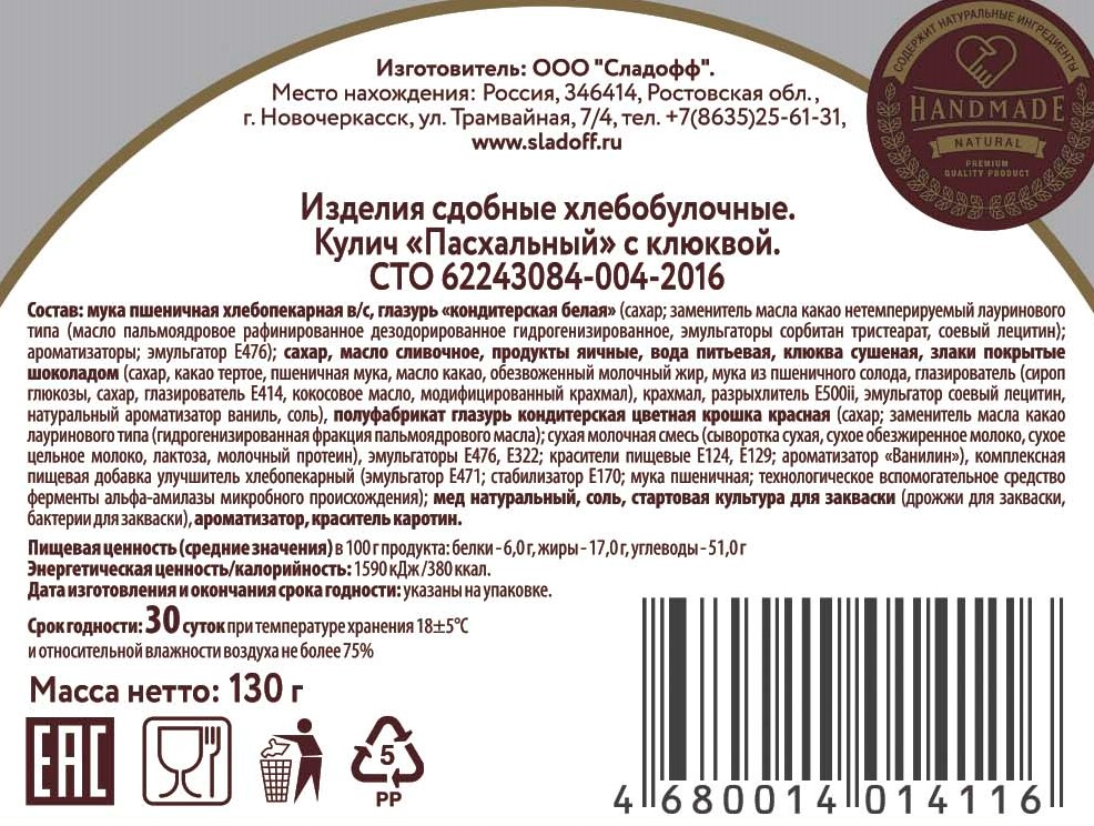 Кулич Пасхальный Культ хлеба с клюквой, 130г