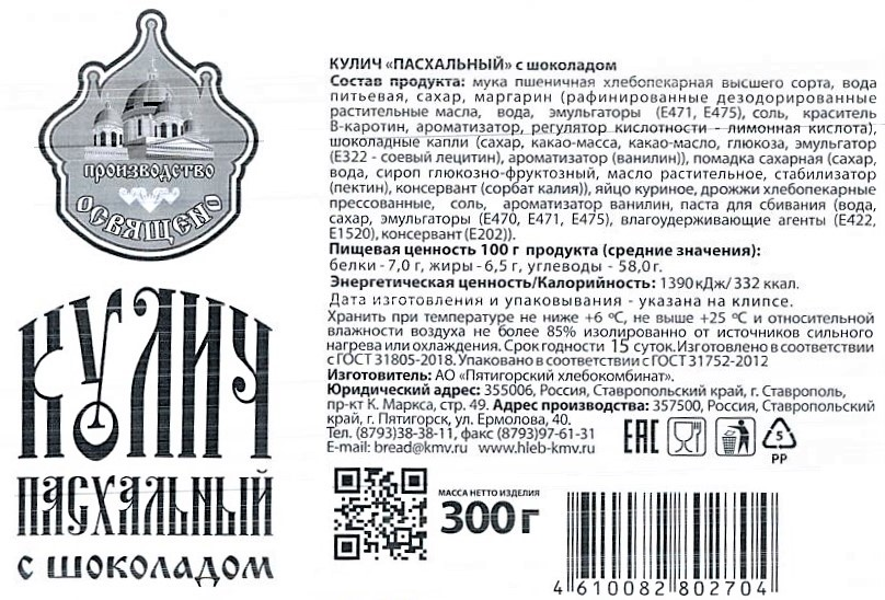 Кулич Пасхальный массой 300г покрытый помадкой с добавлением изюма с посыпкой из шоколадной крошки. Обладает приятным ароматом. Его можно подать к чаю или взять с собой на праздник.