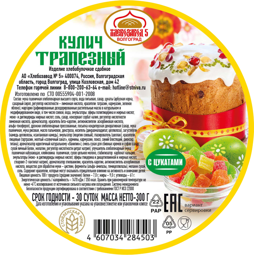 Кулич Хлебозавод №5 Трапезный с цукатами, 300г