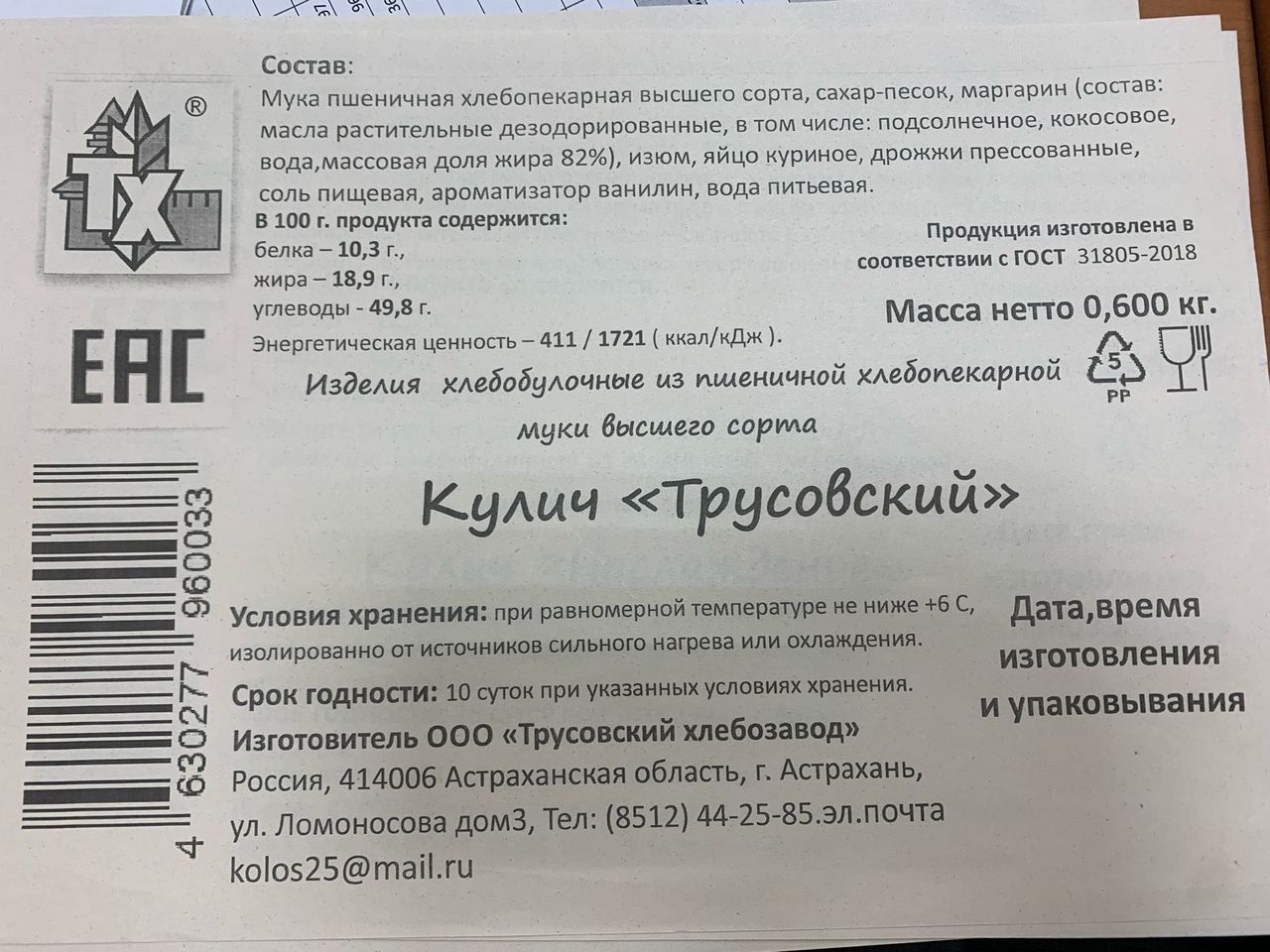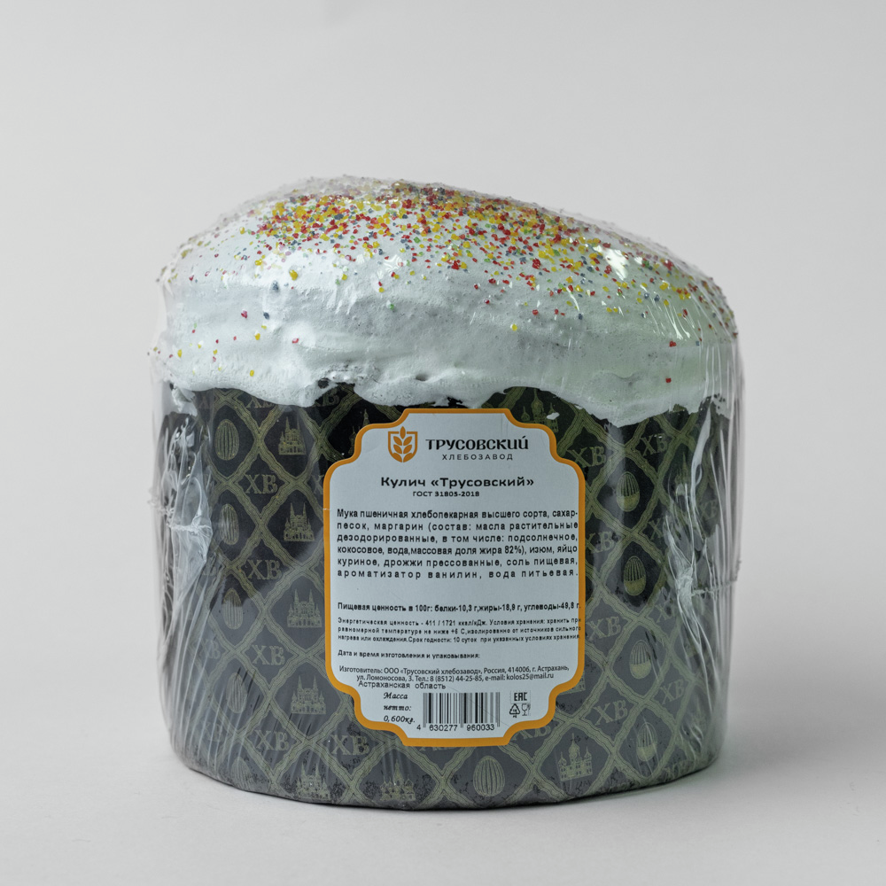 Кулич Трусовский, 600г - сдобный кулич с изюмом, выпеченный по традиционной рецептуре, покрытый цветной глазурью и декоративной кондитерской посыпкой. Это кулич, приготовленный по традиционному рецепту с классической начинкой - изюмом, из муки высшего сорта, с нежным сдобным мякишем и хрустящей корочкой. Украшен глазурью и декоративной посыпкой корочкой.