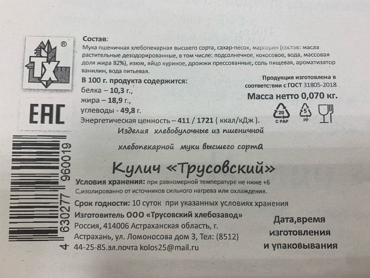 Мука пшеничная хлебопекарная высшего сорта, сахар-песок, маргарин масла растительные дезодорированные, в том числе: подсолнечное, кокосовое, вода, массовая доля жира 82%, изюм, яйцо куриное, дрожжи прессованные, соль пищевая, ароматизатор ванилин, вода питьевая.