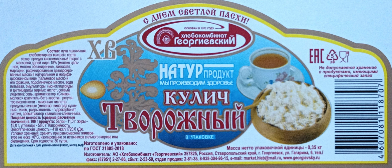 Кулич Натурпродукт Творожный, 350г — традиционное лакомство главного христианского праздника, выпечке которого, как и художественной росписи яиц, в календаре отведен особенный день — Чистый четверг. В православной России форма кулича повторяет очертания церковной просфоры — литургического хлеба, кусочки которого священники раздают во время таинства причащения.