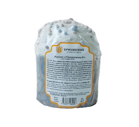 Сдобный кулич содержит в составе творог 9% и изюмом, покрытый белой глазурью и декоративной кондитерской посыпкой. Напоминает творожный кекс. Кулич можно подать к столу как самостоятельный богатый десерт. Он отлично сочетается с молоком и молочными продуктами. Выпечен по традиционной рецептуре в бумажной термоформе, глазирован белой помадкой, украшен яркой разноцветной сахарной посыпкой.