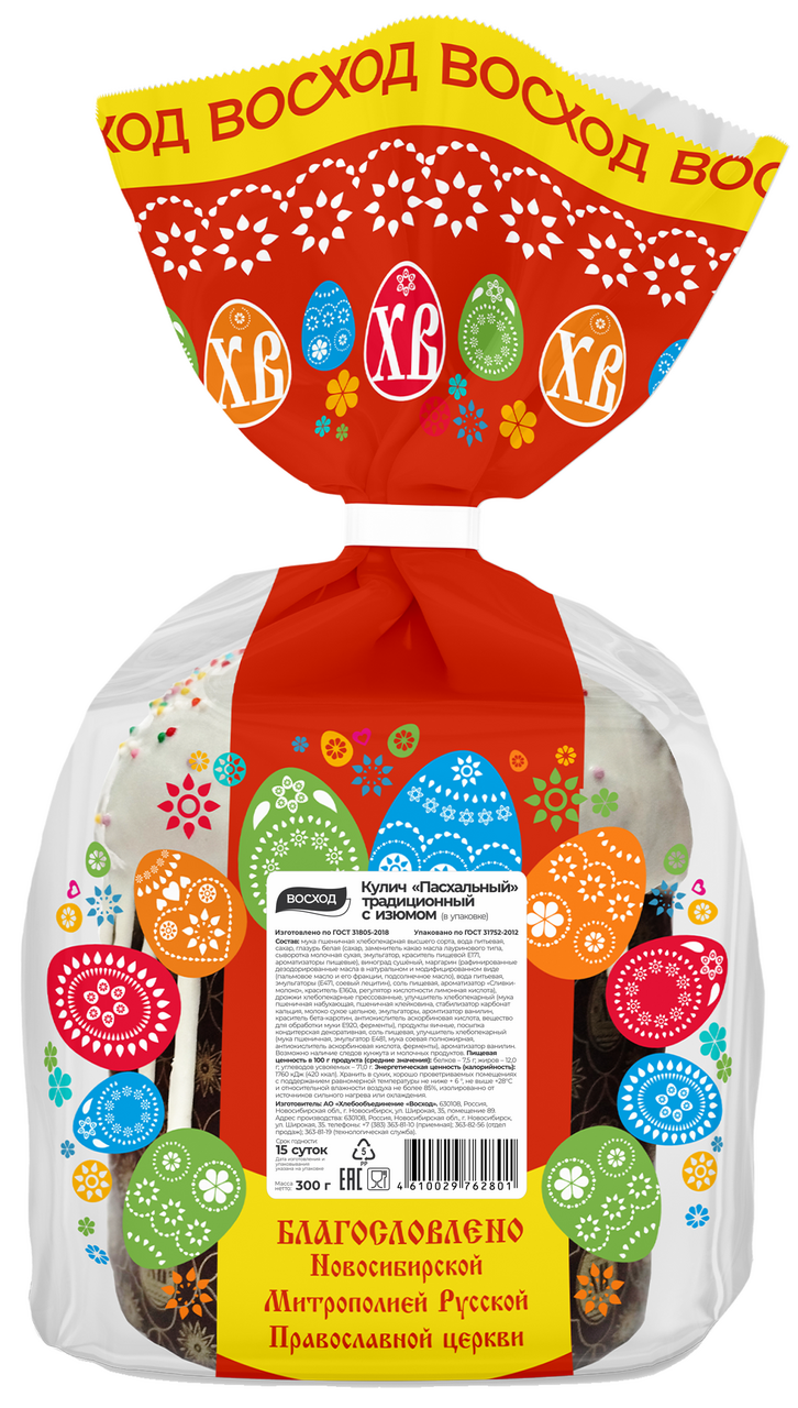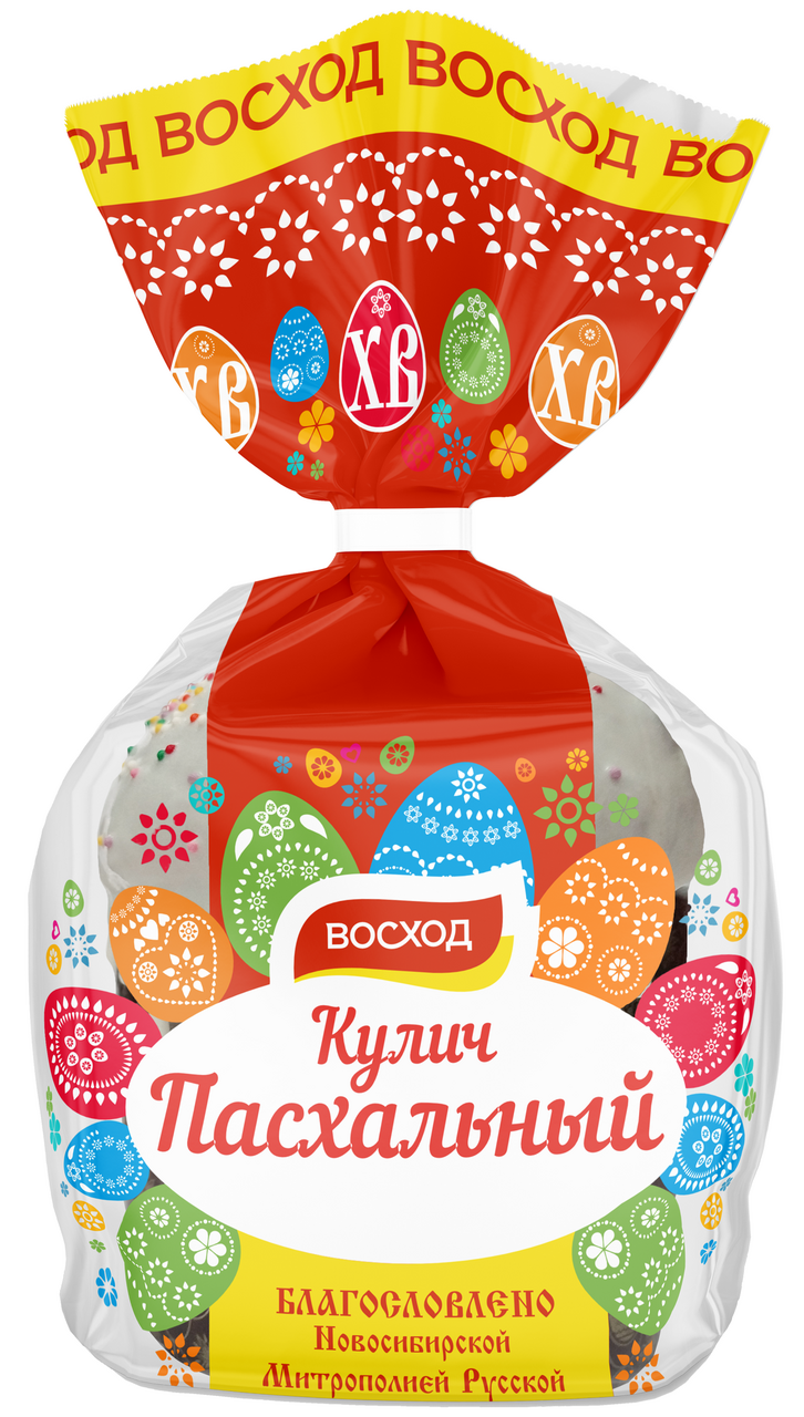 Пасхальный традиционный кулич с воздушного сдобного мякишем с приятным ароматом ванили. Выпеченный из муки высшего сорта, по уникальной рецептуре позволяющей долгое время сохранить первозданную свежесть, тесто замешано с добавлением натуральных куриных яиц, за счет этого на срезе кулич аппетитного желтоватого цвета. Кулич покрыт белой глазурью, которая не осыпается. Куличи традиционно благословлены Новосибирской епархией Русской Православной Церкви, информацию об этом содержится на упаковке куличей. Упакован в брендированный пакет с клипсой. Традиционная праздничная выпечка, которая готовится по оригинальному рецепту. Добавление ванили и отборного изюма делает вкус хлебобулочного изделия гармоничным.