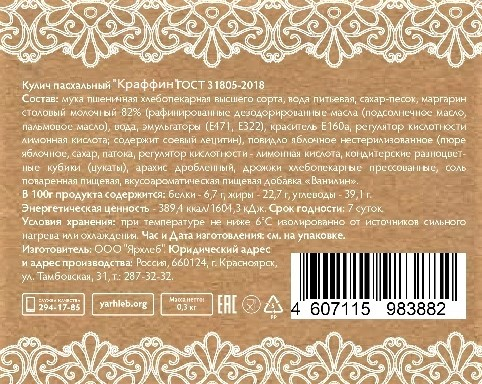 Кулич Ярхлеб Пасхальный краффин, 300г
