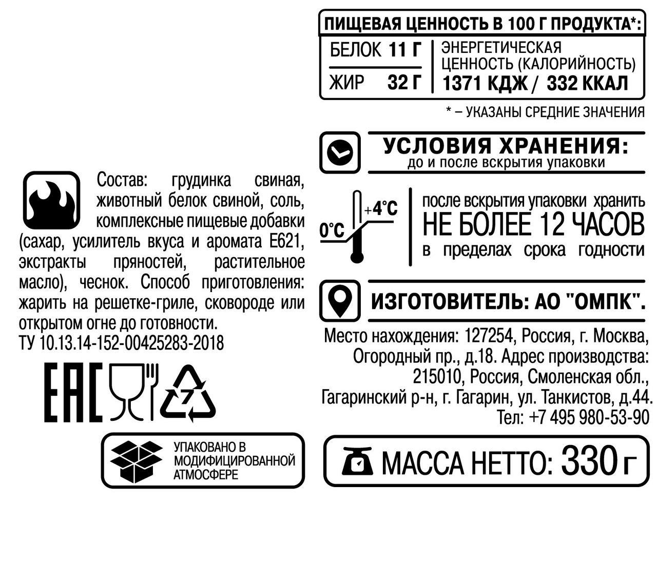 Грудинка свиная, животный белок, соль, комплексные пищевые добавки (сахар, экстракты пряностей, растительное масло, чеснок).