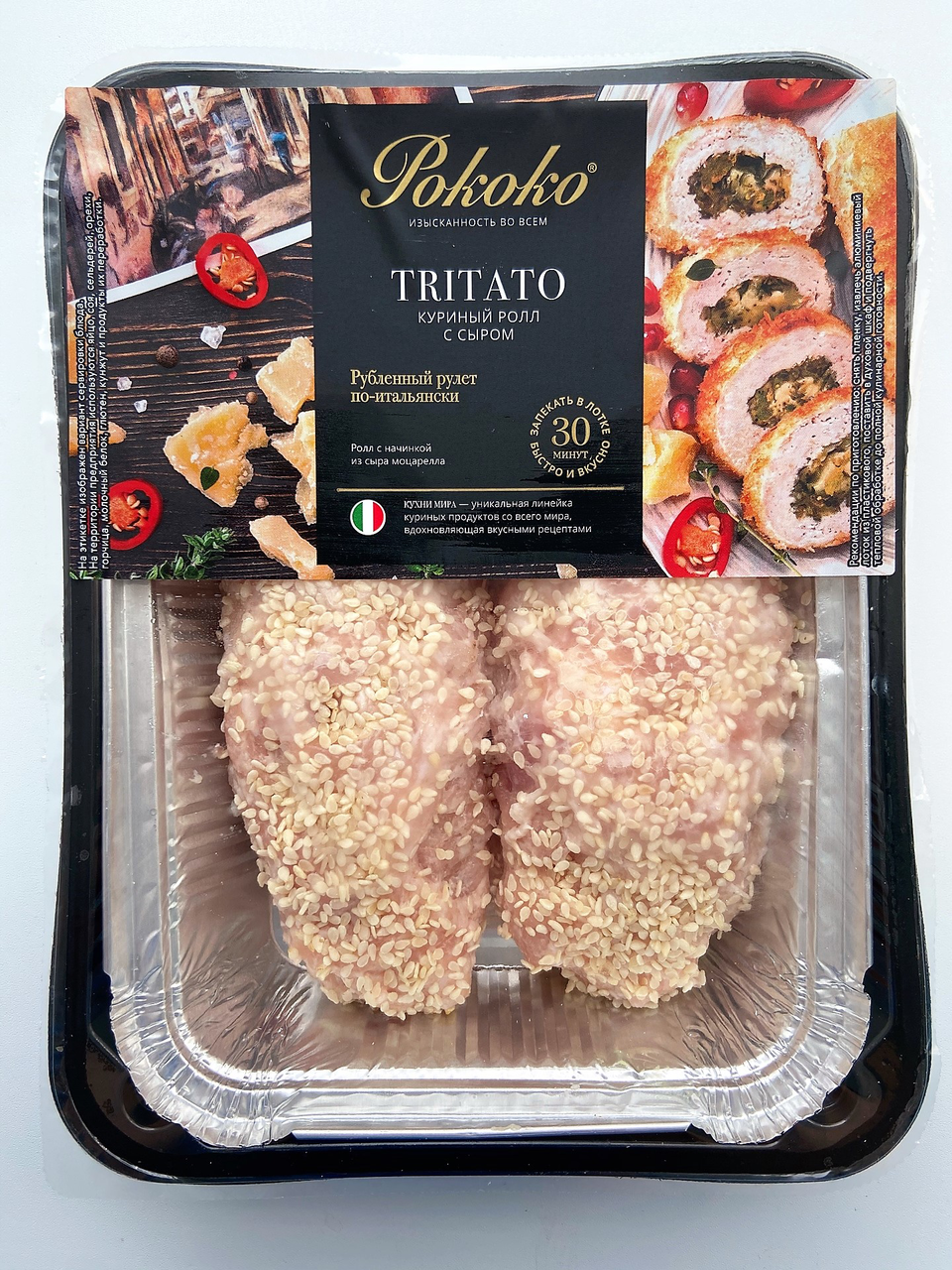 Нежнейшие рулетики из рубленного куриного филе с сочной начинкой из ароматного сыра, болгарского перца, украшен кунжутом. Удобно запекать прямо в лотке!
