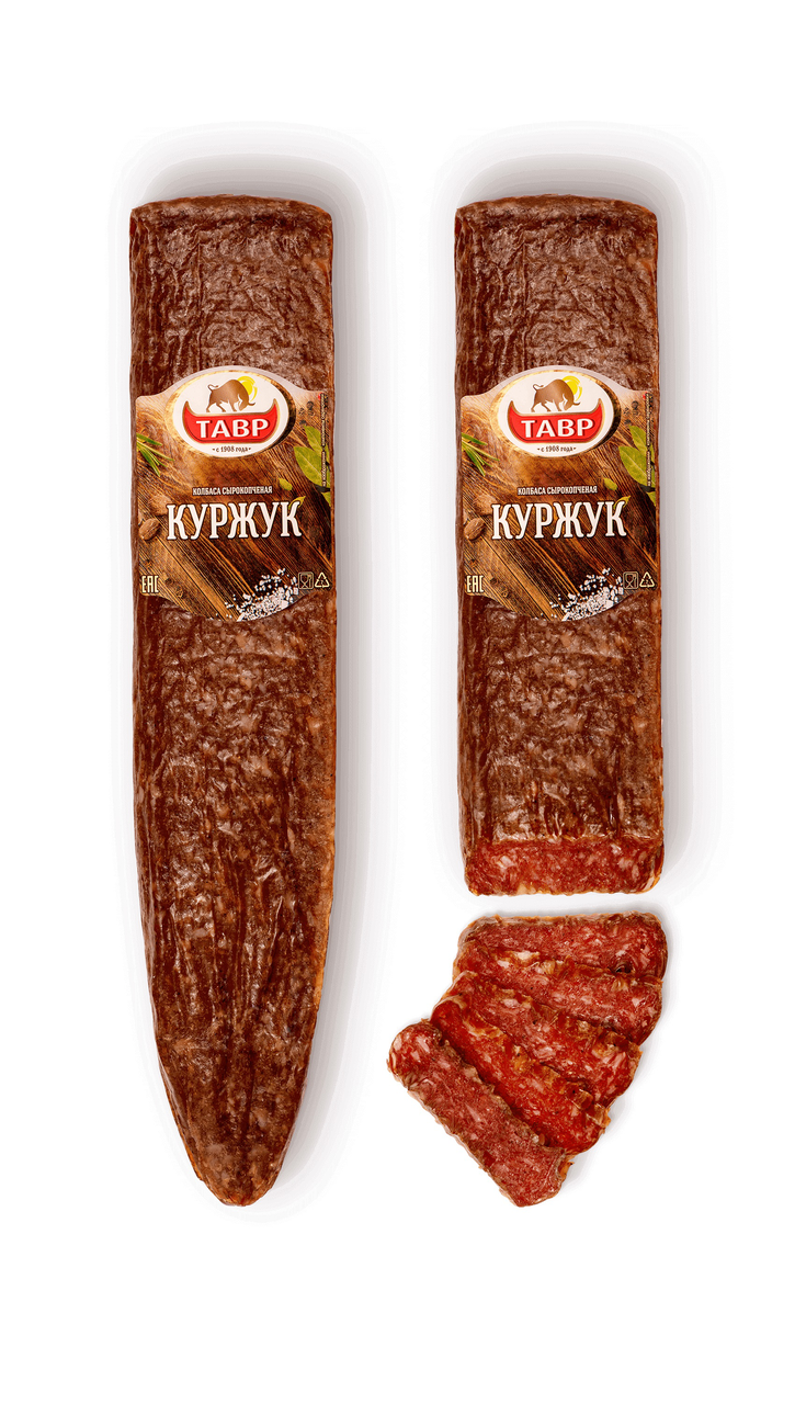 Куржук Тавр сырокопченый, ~200г – это мясной деликатес, который текстурой и формой напоминает суджук, но отличается тем, что основным ингредиентом для его приготовления является мясо птицы. Он обладает пикантным вкусом и приятным ароматом. Продукт станет отличным дополнением к праздничному столу и поможет разнообразить повседневный рацион. Для его изготовления используют филе цыпленка-бройлера, шпик, говяжий жир-сырец. Особые вкусовые и ароматические оттенки ему придает оригинальное сочетание приправ и специй (имбирь, чеснок, чили, паприка). Куржук можно подавать к любимым напиткам в качестве закуски. Также он хорошо сочетается с оливками, маслинами, свежими овощами, поэтому подходит для приготовления канапе. Он содержит оптимальное количество белка, благодаря этому быстро утоляет аппетит. Его удобно брать с собой на пикник или в дальнюю дорогу.