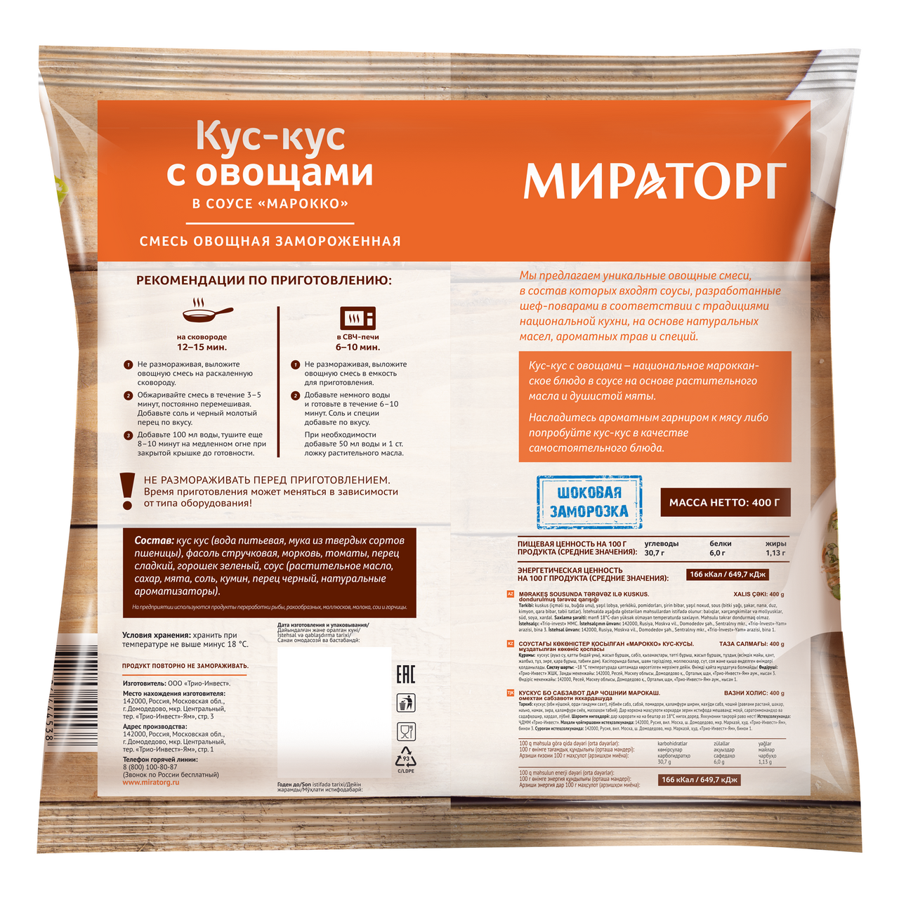 Кус-кус Мираторг с овощами, 400г – это овощная смесь (замороженная), которая придется по душе взрослым и детям. Это не только вкусное, но и полезное блюдо, богатое витаминами и минералами благодаря обилию овощей, которые подверглись шоковой заморозке, не потеряв своих свойств. В пачке содержатся, прекрасно дополняя друг друга, кус-кус, маленькие морковки, свежий зеленый горошек, черри, стручковая фасоль, сладкая паприка. В состав блюда входит соус шеф-повара Марокко. Смесь очень проста в приготовлении: уже нарезанные овощи следует слегка обжарить на сковороде с небольшим количеством растительного масла или приготовить в микроволновке. При жарке смесь источает ярко выраженный пряный аромат, в котором легко угадать мяту и кумин. Во время приготовления овощи успевают приготовиться и не превращаются в кашицу. Блюдо прекрасно подходит к мясу как гарнир или может выступать в качестве полноценного самостоятельного блюда.