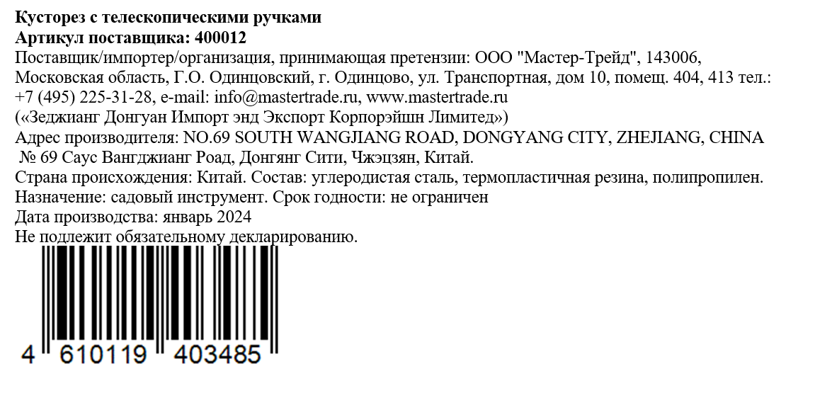 Инструмент представляет собой большие садовые ножницы с остро заточенными лезвиями. Имеет телескопическую рукоятку. Кусторез с телескопическими ручками. Лезвие из углеродистой стали, ручка из термопластичного каучука и замок из полипропилена.