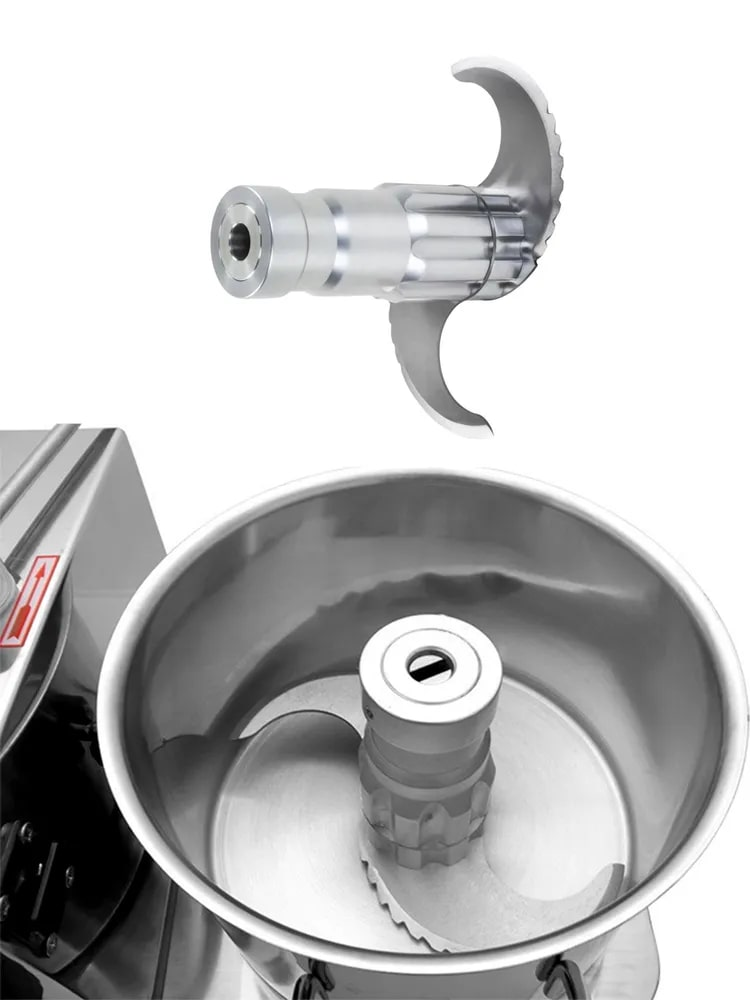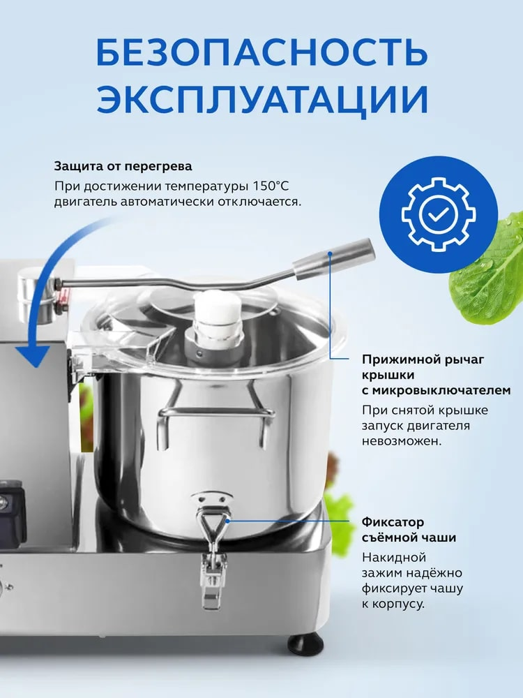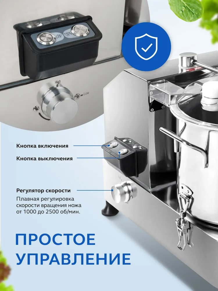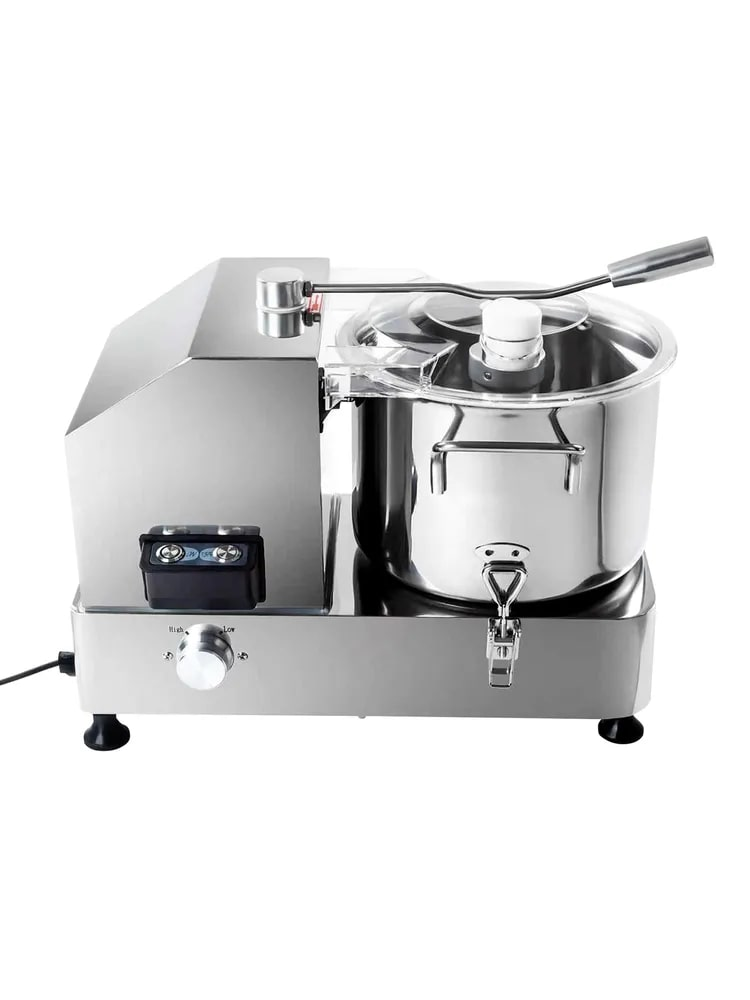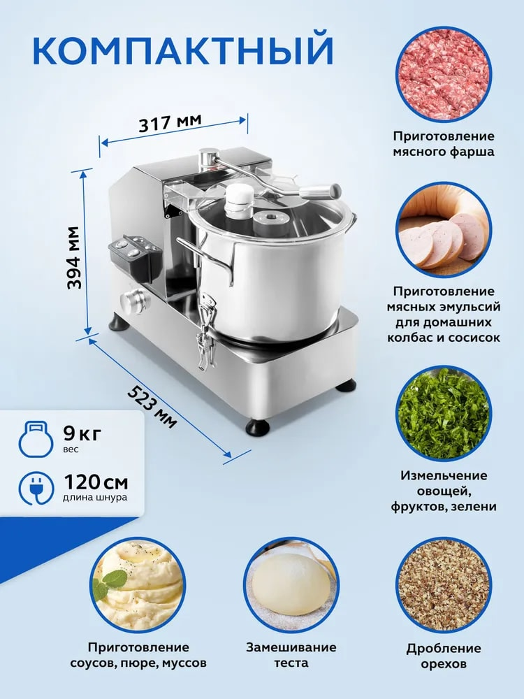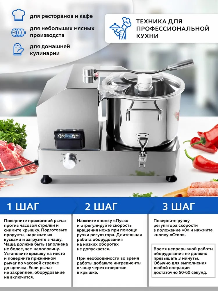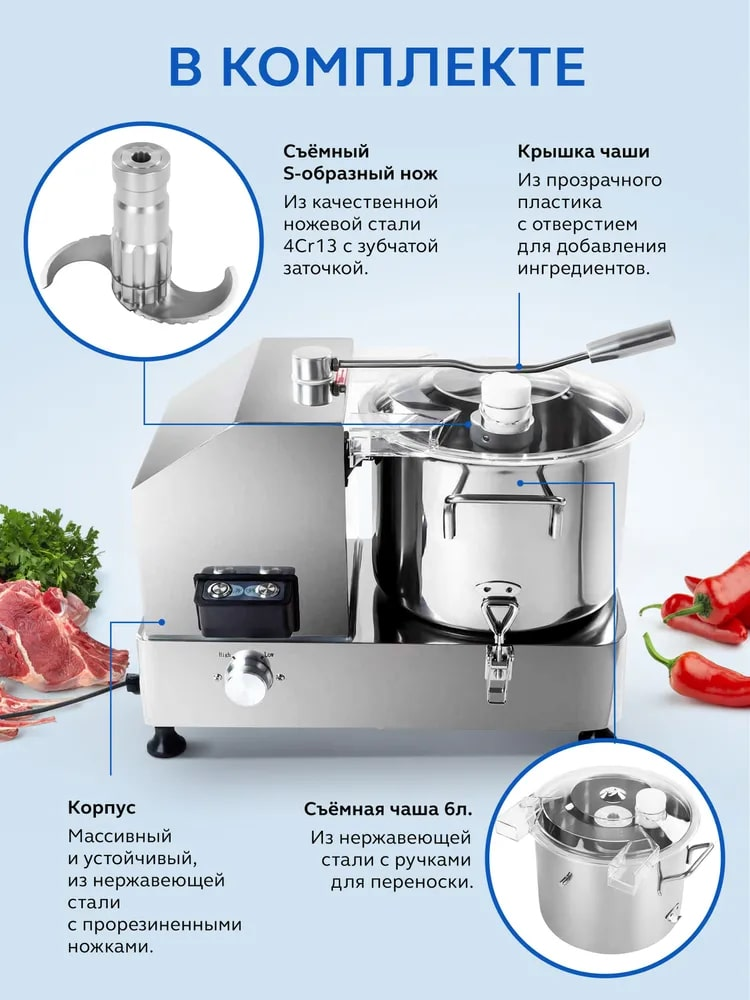 Куттер-миксер электрический настольный Gastrorag HR-6 - это техника для профессиональной кухни, которая используется для измельчения и смешивания пищевых продуктов. С его помощью вы сможете приготовить мясной фарш различной консистенции, густые соусы, овощные и фруктовые пюре, а также замесить тесто, измельчить орехи, панировочные сухари, зелень. Хорошо получаются паштеты и террины, а также мясные эмульсии для вареных колбас, сосисок и сарделек. Блендер для мяса полностью выполнен из нержавеющей стали 304 и оснащен чашей объемом 6 литров, прозрачной крышкой и S-образным ножом из ножевой стали 4Cr13 с серрейторной (зубчатой) заточкой. Кухонный измельчитель для мяса и овощей имеет функцию плавной регулировки скорости в диапазоне от 1000 до 2500 оборотов в минуту. Конструкция куттера гарантирует безопасность эксплуатации и долгий срок службы. Защитные приспособления: фиксатор чаши, прижимной рычаг крышки с микровыключателем, защита от перегрева (если температура двигателя достигнет 115С, измельчитель автоматически отключится). Время непрерывной работы - 3 минуты. Выполнение любой операции обычно занимает не более 1 минуты.