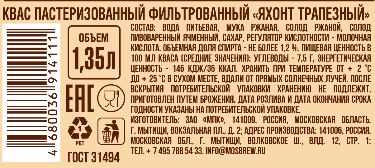 Фильтрованный пастеризованный квас Трапезный торговой марки Яхонт не только эффективно утоляет жажду в жаркое время года, но и отлично подходит для приготовления традиционной русской окрошки. Для изготовления напитка используются только натуральные компоненты без искусственных консервантов, в том числе чистая артезианская вода, ячменный и ржаной солод, а также сахар. Жестяную банку с ключом для быстрого открывания удобно взять с собой на пикник или на прогулку.