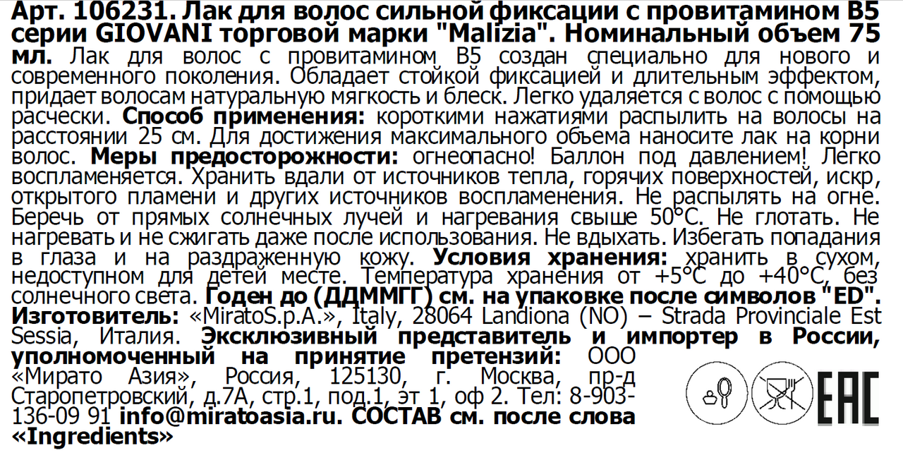 Лак для волос Malizia Giovani с провитамином B5 сильная фиксация, 75мл