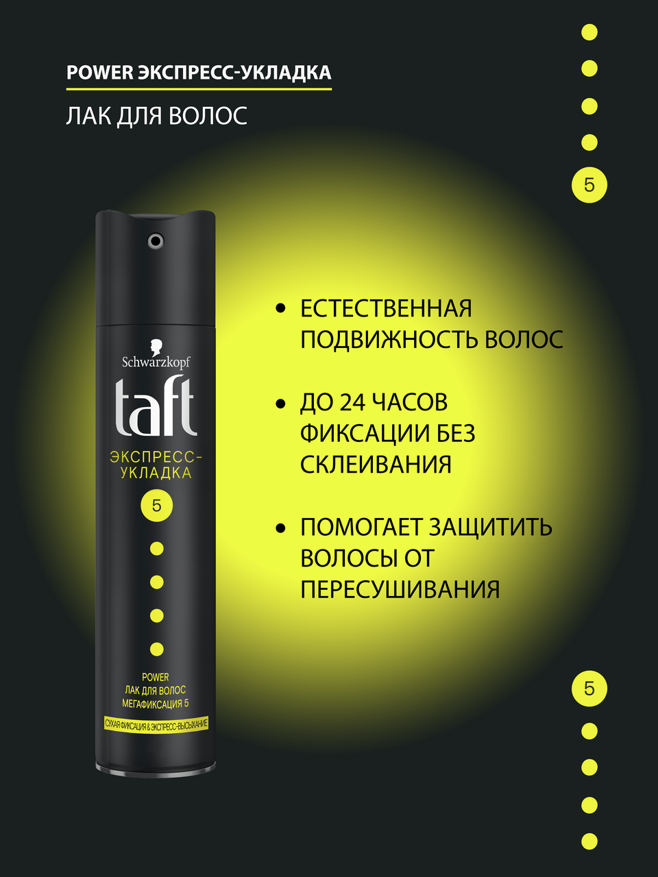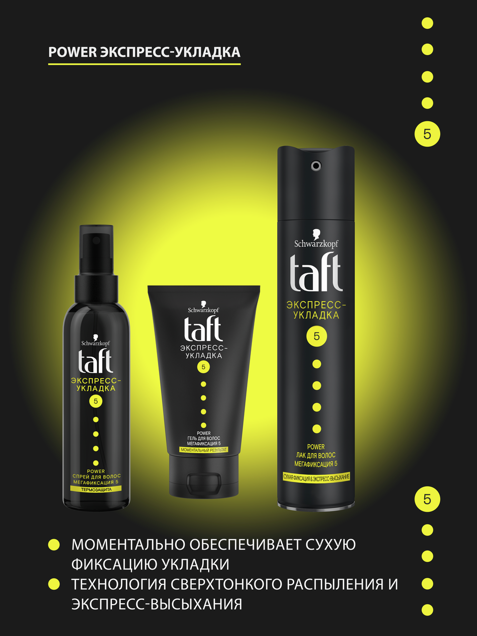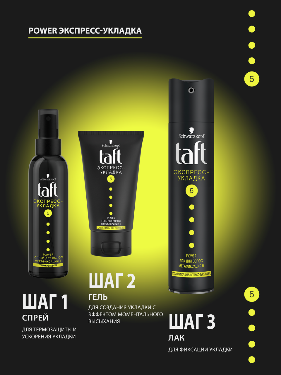 Экспресс-укладка – мегафиксация. Формула Тафт моментально обеспечивает сухую фиксацию укладки благодаря технологии сверхтонкого распыления и экспресс-высыхания! Формула Тафт для превосходной фиксации и защиты укладки до 3-х дней в любую погоду: от ветра, влажности, УФ-лучей и от влияния загрязнения окружающей среды. Фиксация укладки до 3 дней без склеивания и следов. Помогает защитить волосы от пересушивания, не утяжеляя их. Защита в любую погоду.